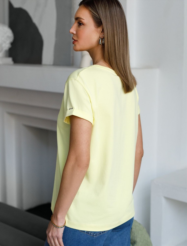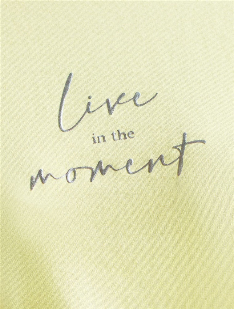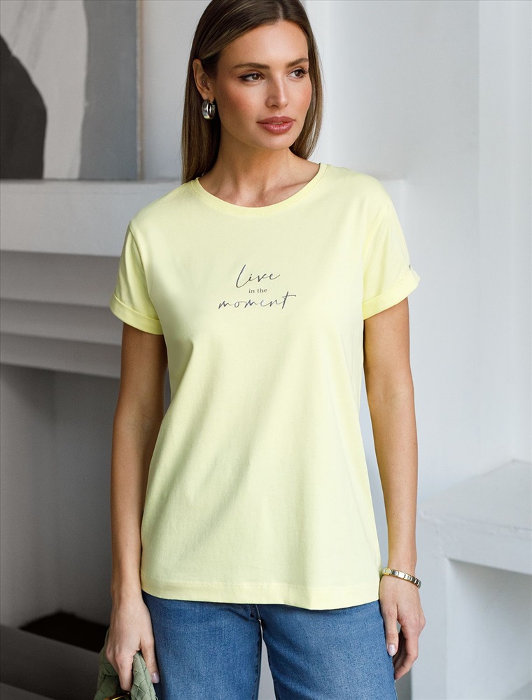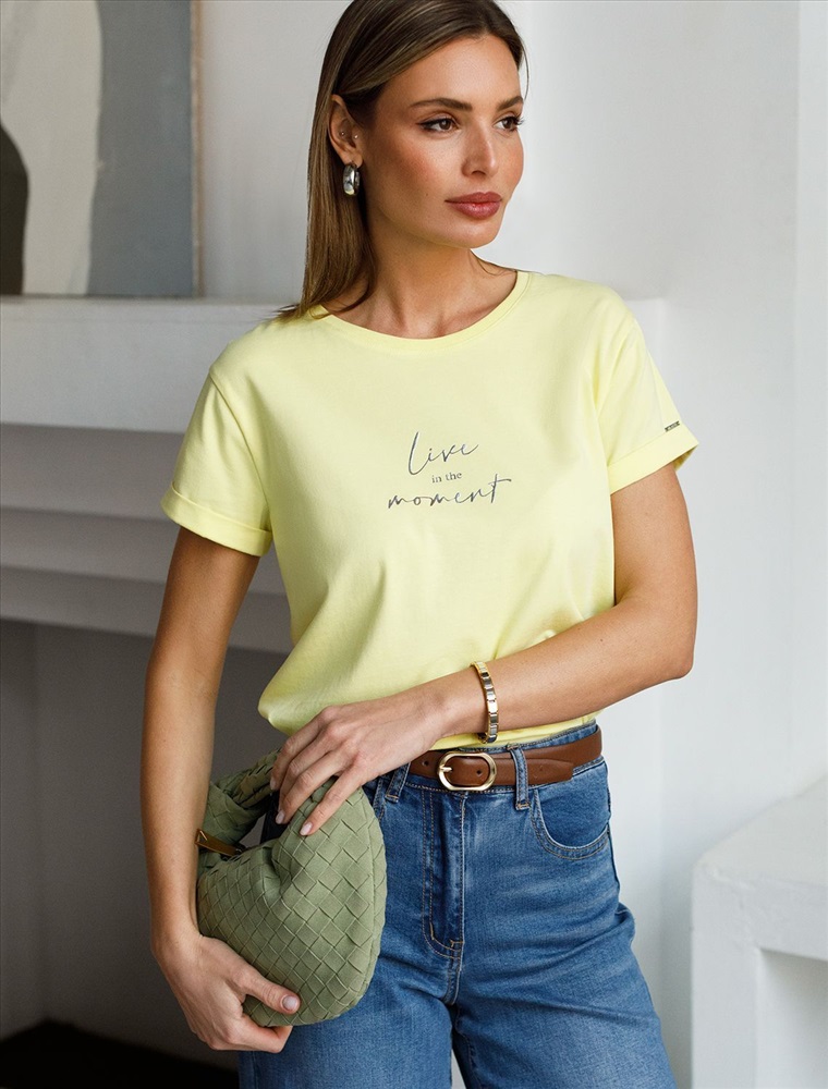 Плотность: 170 Г/м2 Модная футболка лимонного цвета привлекает внимание своим интересным дизайном и ярким принтом. Благодаря прямому крою изделие комфортно садится на любую фигуру, в том числе на большие размеры, и не сковывает движений. Круглый вырез подчеркивает современный стиль, а натуральный материал из хлопка с добавлением эластана обеспечивает удобство в повседневной носке и приятные тактильные ощущения. Прочность и износостойкая структура сохраняет первоначальную форму футболки после множества стирок. Рукава имеют аккуратные подгибы, что придает изделию завершенность и помогает сохранять аккуратный внешний вид. Принт надписи нанесен красками с устойчивым покрытием, перевод надписи: Live in the moment - Жить в данный момент. Стильная футболка гармонично вписывается в любой гардероб и подойдет для прогулок, отдыха дома или неформальных встреч. Благодаря особенностям кроя модель хорошо сидит, скрывая недостатки и подчеркивая достоинства. Удобная футболка идеально сочетается с базовыми вещами, позволяя создавать новые интересные образы каждый день. Комментарии к товару