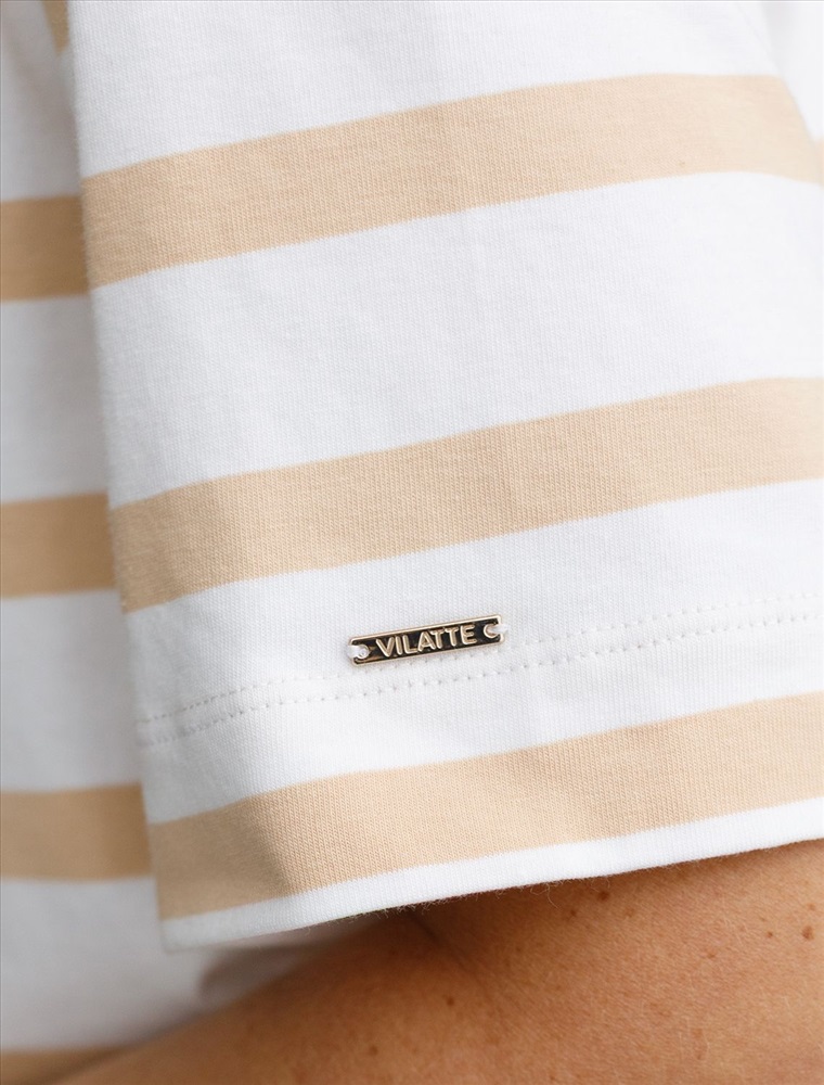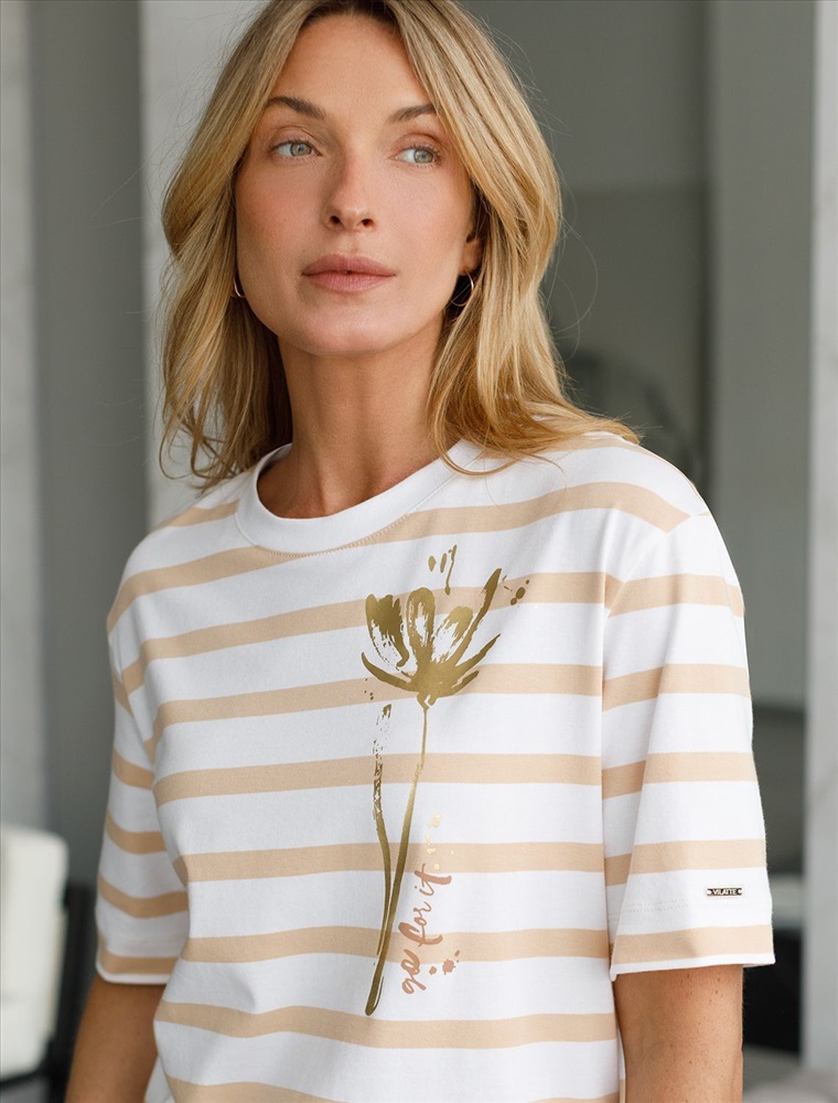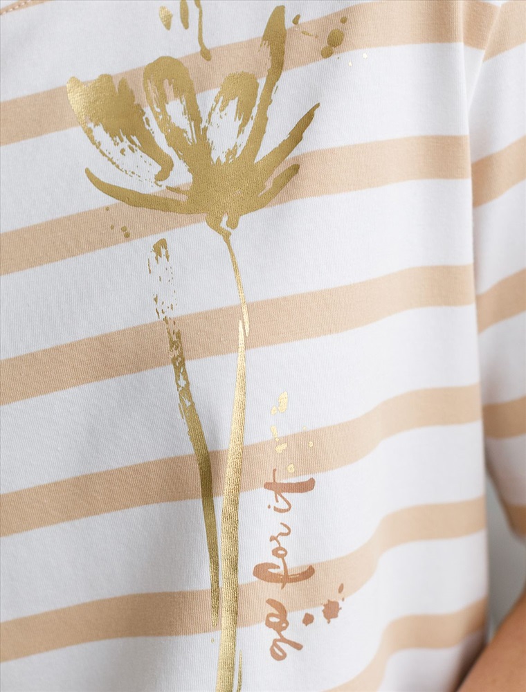 Плотность: 170 Г/м2 Модная футболка белого цвета в горизонтальную бежевую полоску привлекает внимание своим интересным дизайном и ярким принтом. Благодаря прямому крою изделие комфортно садится на любую фигуру, в том числе на большие размеры, и не сковывает движений. Круглый вырез подчеркивает современный стиль, а натуральный материал плотностью 170 Г/м2 из хлопка с добавлением эластана обеспечивает удобство в повседневной носке и приятные тактильные ощущения. Прочность и износостойкая структура позволяют сохранять свежий внешний вид после множества стирок. Принт в виде надписи нанесен красками с устойчивым покрытием, перевод надписи: Go for it - Действуй. Стильная футболка гармонично вписывается в любой гардероб и подойдет для прогулок, отдыха или неформальных встреч. Благодаря особенностям кроя модель хорошо сидит, скрывая недостатки и подчеркивая достоинства. Яркая футболка идеально сочетается с базовыми вещами, позволяя создавать новые интересные образы каждый день. Комментарии к товару