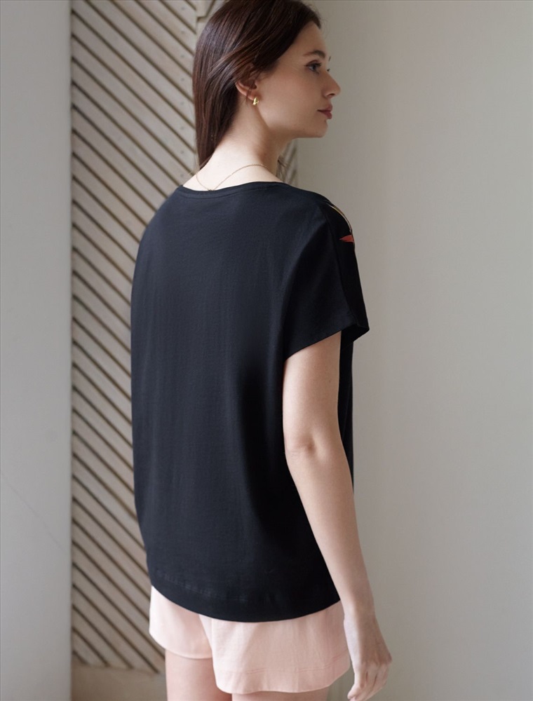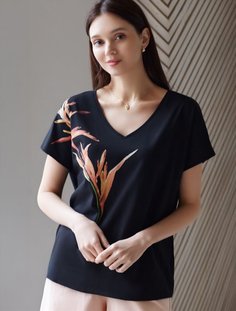 Свободная футболка черного цвета с V-вырезом и цельнокроеным рукавом выполнена из натурального 100% хлопка. Главная особенность этого изделия — тонкое кулирное полотно, которое легче и воздушнее стандартного варианта. Благодаря своей деликатной текстуре футболка идеально подходит для домашних образов и пижамных комплектов. Ткань отлично дышит, обеспечивая максимальный уют во время сна и отдыха. V-вырез утонченно подчеркивает линию шеи, а свободный крой скрывает возможные недостатки фигуры. Такая оверсайз футболка отлично подойдет на большие размкры и для тех, кто ценит комфорт и стиль одновременно. Принт в виде ярких цветов добавляет повседневной футболке оригинальности и актуальности для любой домашней обстановки. Эта футболка женственно смотрится и дарит ощущение уюта, делая ее необходимым элементом домашнего гардероба.