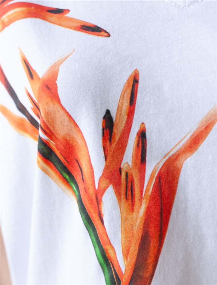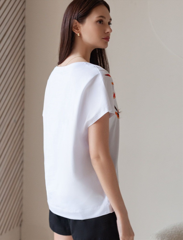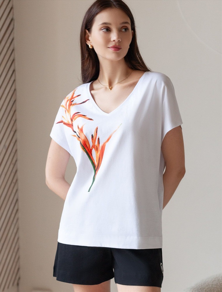 Свободная футболка белого цвета с V-вырезом и цельнокроеным рукавом выполнена из натурального 100% хлопка. Главная особенность этого изделия — тонкое кулирное полотно, которое легче и воздушнее стандартного варианта. Благодаря своей деликатной текстуре футболка идеально подходит для домашних образов и пижамных комплектов. Ткань отлично дышит, обеспечивая максимальный уют во время сна и отдыха. V-вырез утонченно подчеркивает линию шеи, а свободный крой скрывает возможные недостатки фигуры. Такая оверсайз футболка отлично подойдет на большие размкры и для тех, кто ценит комфорт и стиль одновременно. Принт в виде ярких цветов добавляет повседневной футболке оригинальности и актуальности для любой домашней обстановки. Эта футболка женственно смотрится и дарит ощущение уюта, делая ее необходимым элементом домашнего гардероба.