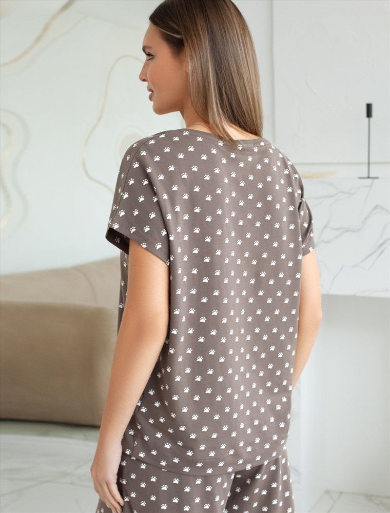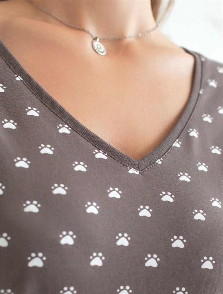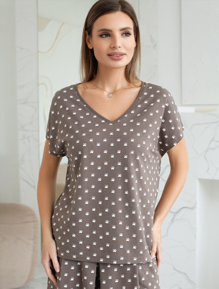 Плотность: 140 Г/м2 Свободная футболка кофейного цвета с V-вырезом и цельнокроеным рукавом выполнена из премиального 100% хлопка плотностью 160 Г/м2. Главная особенность этого изделия — тонкое кулирное полотно, которое легче и воздушнее стандартного варианта. Благодаря своей деликатной текстуре футболка идеально подходит для домашних образов и пижамных комплектов. Ткань отлично дышит, обеспечивая максимальный уют во время сна и отдыха. V-вырез утонченно подчеркивает линию шеи, а свободный крой скрывает возможные недостатки фигуры. Принт в виде лапок добавляет повседневной футболке оригинальности и актуальности для любой домашней обстановки. Такая оверсайз футболка отлично подойдет на большие размеры и для тех, кто ценит комфорт и стиль одновременно. Эта футболка женственно смотрится и дарит ощущение уюта, делая ее необходимым элементом домашнего гардероба. Рекомендуем сочетать с артикулами: D44,160, D44.161, D44.162, D44.163, D44.161, D48.011, D48.012, D46.058 Комментарии к товару