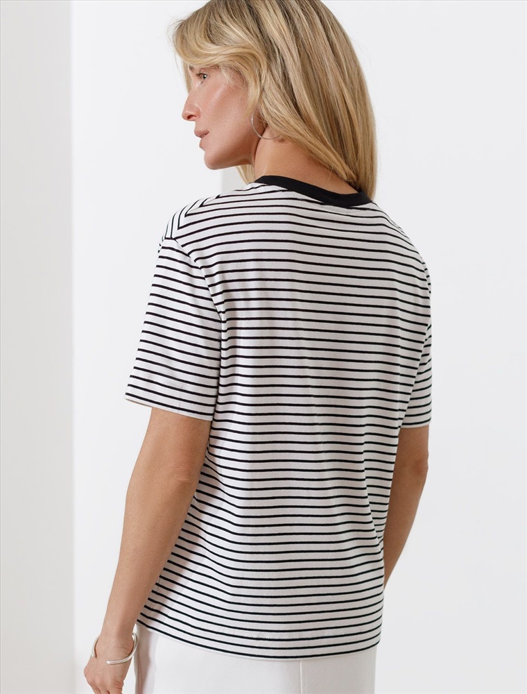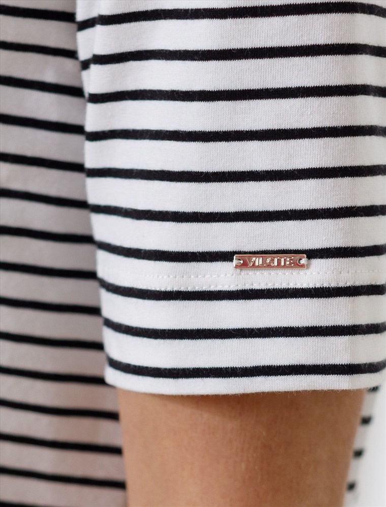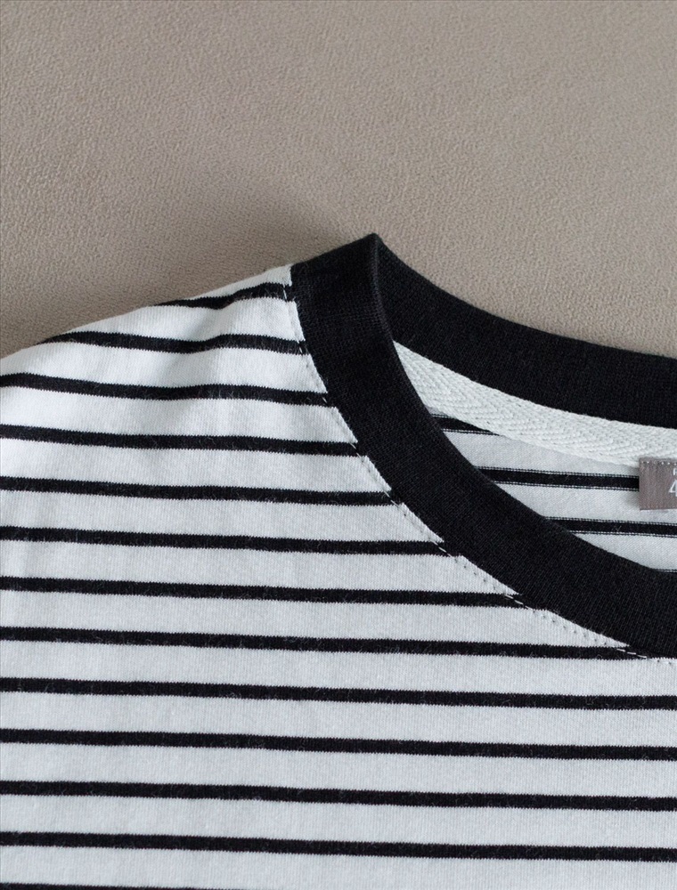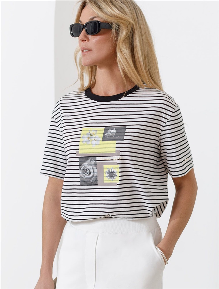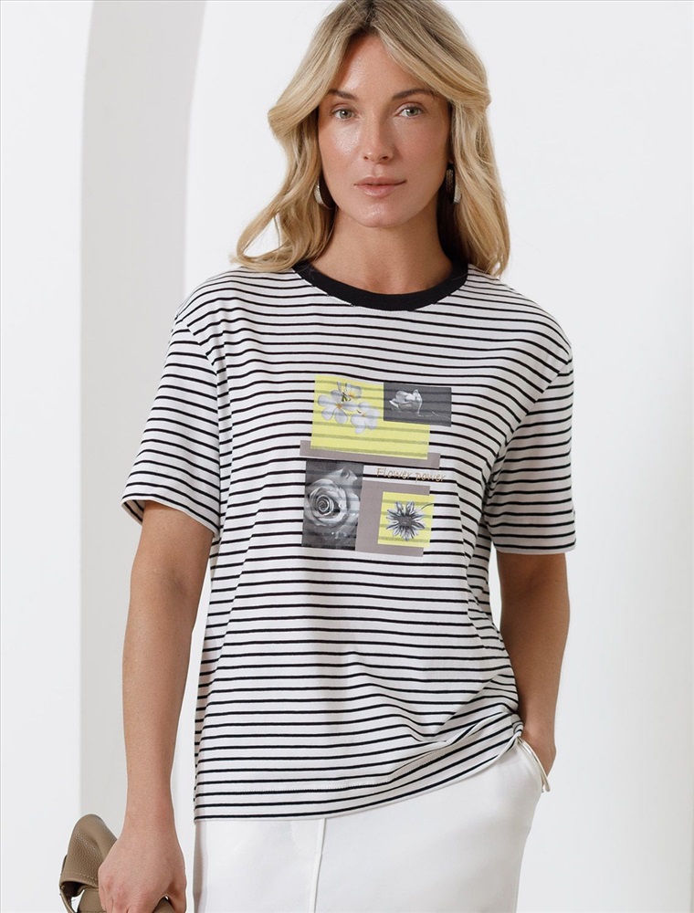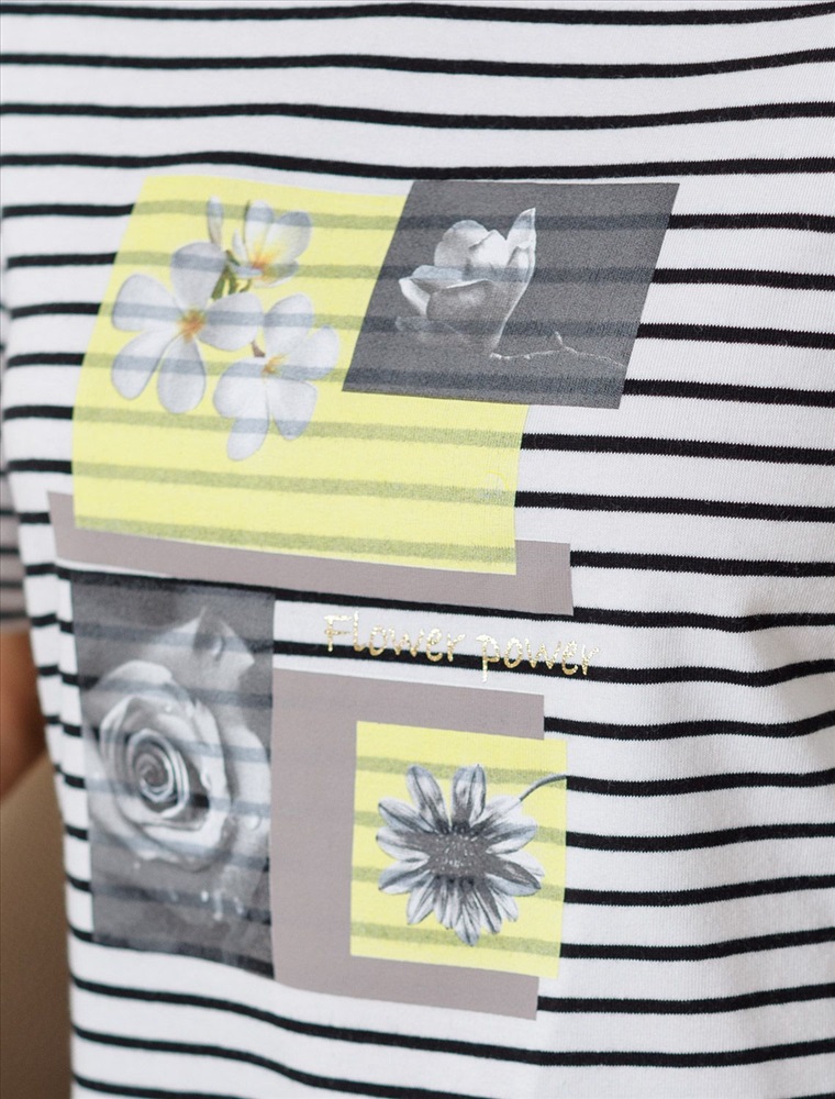 Плотность: 170 Г/м2 Модная футболка белого цвета в тонкую горизонтальную черную полоску привлекает внимание своим интересным дизайном и ярким принтом. Благодаря прямому крою изделие комфортно садится на любую фигуру, в том числе на большие размеры, и не сковывает движений. Круглый вырез подчеркивает современный стиль, а натуральный материал из хлопка плотностью 170 Г/м2 с добавлением эластана обеспечивает удобство в повседневной носке и приятные тактильные ощущения. Прочность и износостойкая структура позволяют сохранять свежий внешний вид после множества стирок. Принт в виде цветов и надписи нанесен красками с устойчивым покрытием, перевод надписи: Everyday essentials - Повседневные вещи, которые необходимы., Стильная футболка гармонично вписывается в любой гардероб и подойдет для прогулок, отдыха или неформальных встреч. Благодаря особенностям кроя модель хорошо сидит, скрывая недостатки и подчеркивая достоинства. Яркая футболка идеально сочетается с базовыми вещами, позволяя создавать новые интересные образы каждый день. Комментарии к товару