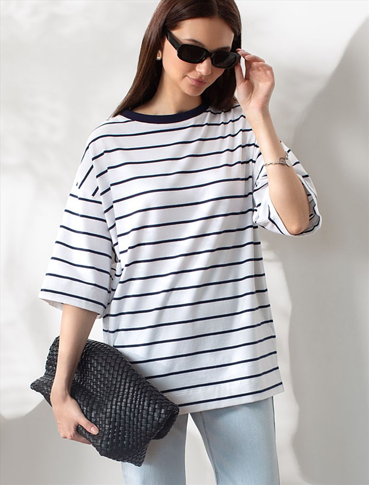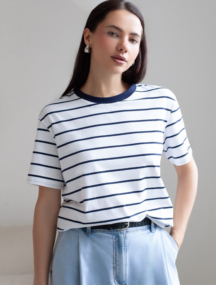 Плотность: 170 Г/м2 Стильная и модная женская футболка белого цвета в синюю полоску станет отличным дополнением к вашему гардеробу. Футболка плотностью 170 Г/м2 изготовлена из премиального хлопка с добавлением эластана. Добавление эластана в состав изделия способствует формоустойчивости. Эта классическая футболка свободногокроя подходит для создания кэжуал образа на каждый день и идеально подойдет для работы. Модель не мнется, что делает ее практичным вариантом для активных женщин, которые ценят стиль и удобство. Благодаря современному принту полоска эта футболка легко комбинируется с различными элементами гардероба. Она станет универсальным решением для тех, кто предпочитает комфортный стиль casual. Повседневная футболка подчеркнет вашу индивидуальность и позволит вам выглядеть привлекательно в любой ситуации. Легкость в уходе и высокая износостойкость делают ее незаменимой вещью в вашем гардеробе. Одевайте эту модель как на работу, так и на встречу с друзьями — она всегда будет уместна! Стильная и практичная модель с простым кроем и лаконичным дизайном - идеальный вариант для тех, кто ценит качество, минимализм и классический стиль в одежде. Комментарии к товару