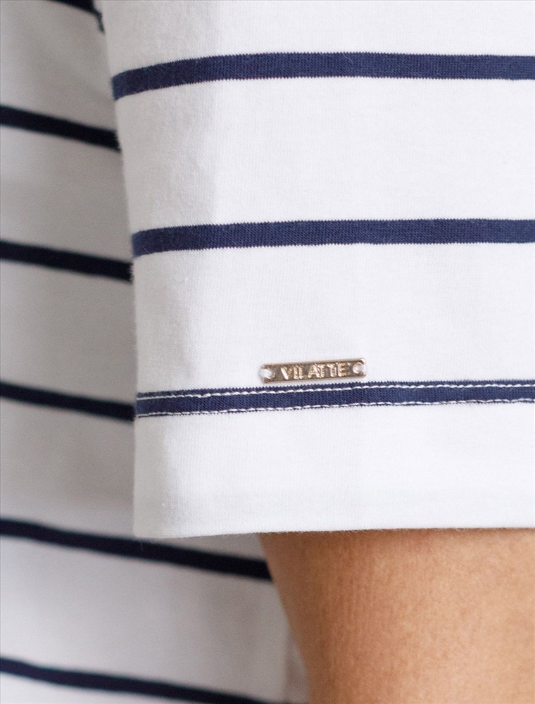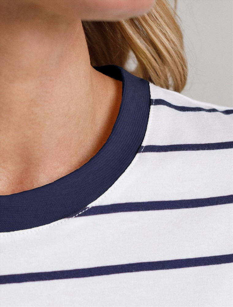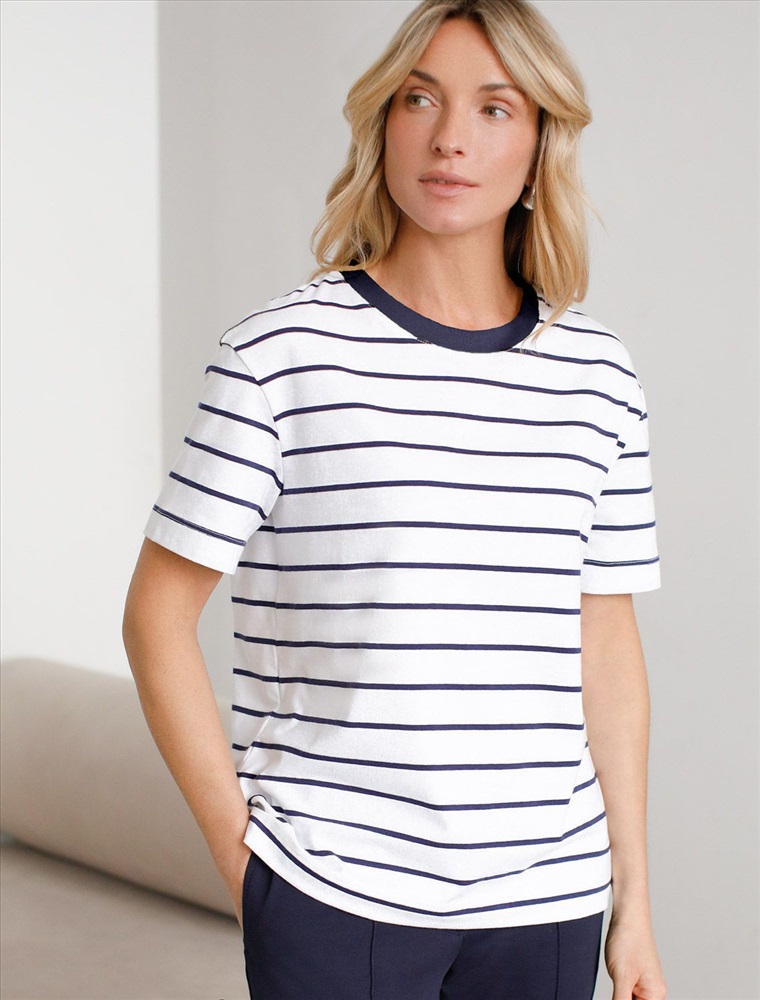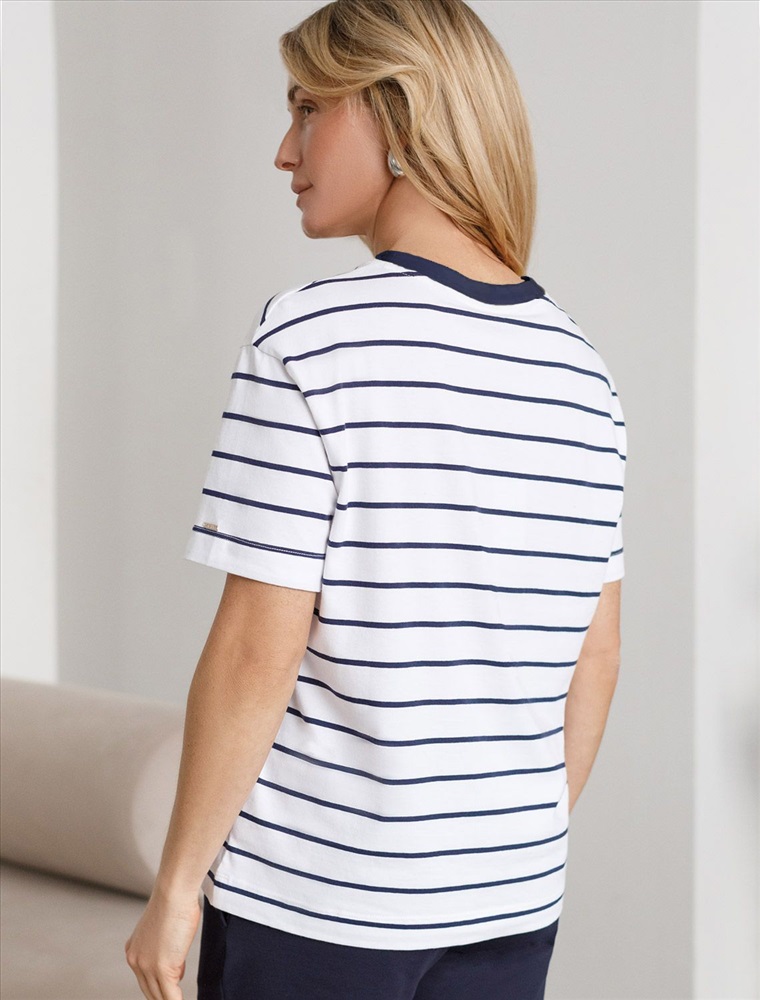 Свободная футболка белого цвета в темно-синюю полоску из премиального хлопка плотностью 170 Г/м2 станет универсальным решением для создания стильного и комфортного образа. Футболка прямого кроя идеально садится на любую фигуру, обеспечивая свободу движений. Дышащая ткань из натурального хлопка делает изделие легким и приятным к телу, что особенно важно в теплое время года, отлично пропускает воздух и не вызывает дискомфорта при длительном ношении. Модная футболка в полоску добавляет яркости образу, сохраняя баланс между минимализмом и выразительностью.