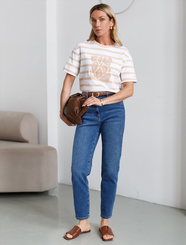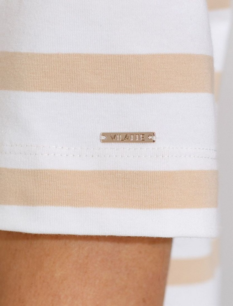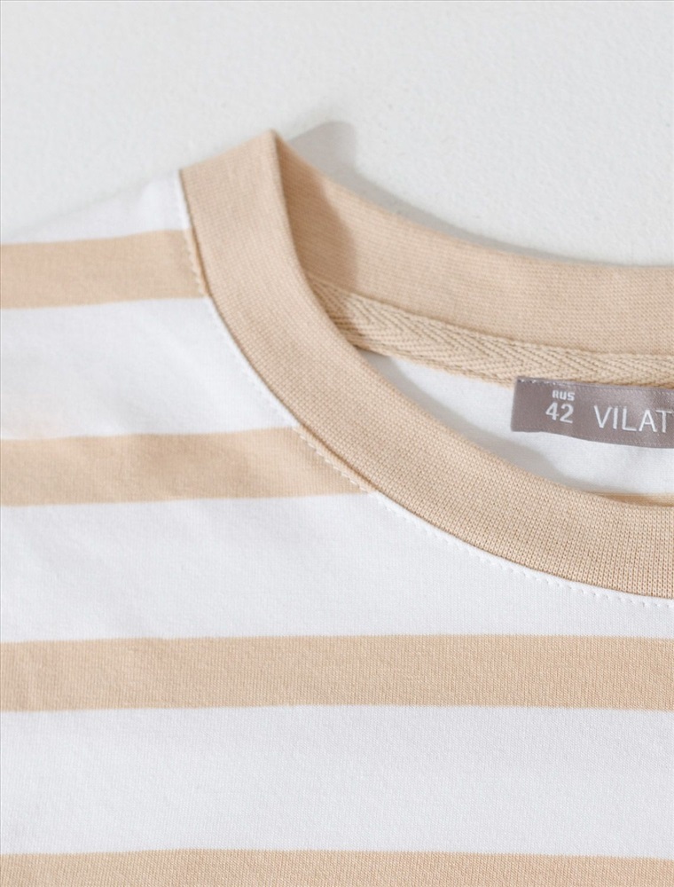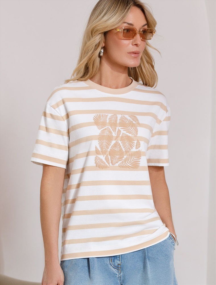Модная футболка белого цвета в горизонтальную бежевую полоску привлекает внимание своим интересным дизайном и ярким принтом. Благодаря прямому крою изделие комфортно садится на любую фигуру, в том числе на большие размеры, и не сковывает движений. Круглый вырез подчеркивает современный стиль, а натуральный материал плотностью 170 Г/м2 из хлопка с добавлением эластана обеспечивает удобство в повседневной носке и приятные тактильные ощущения. Прочность и износостойкая структура позволяют сохранять свежий внешний вид после множества стирок. Принт в виде листиков нанесен красками с устойчивым покрытием. Стильная футболка гармонично вписывается в любой гардероб и подойдет для прогулок, отдыха или неформальных встреч. Благодаря особенностям кроя модель хорошо сидит, скрывая недостатки и подчеркивая достоинства. Яркая футболка идеально сочетается с базовыми вещами, позволяя создавать новые интересные образы каждый день.
