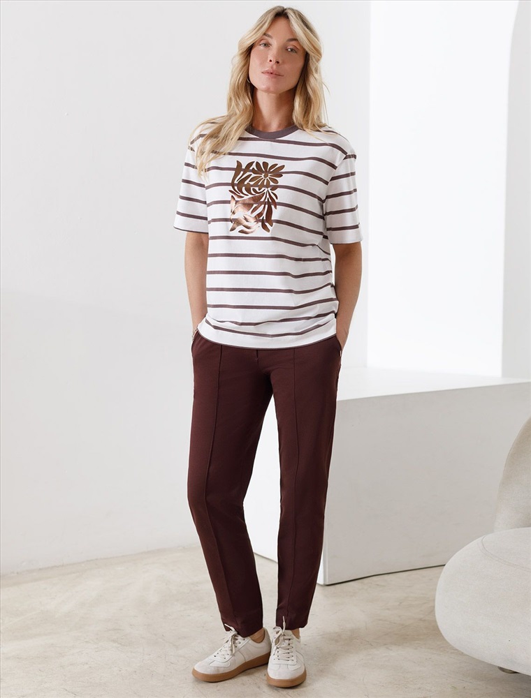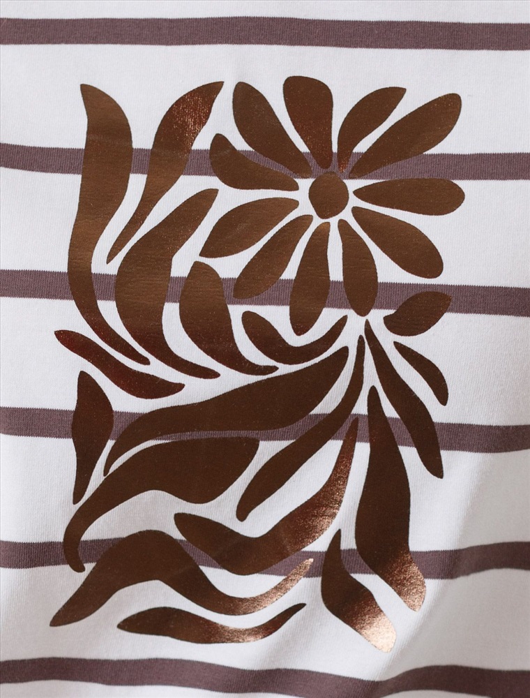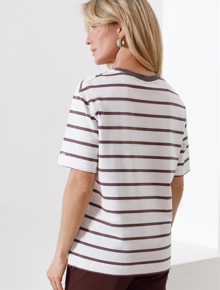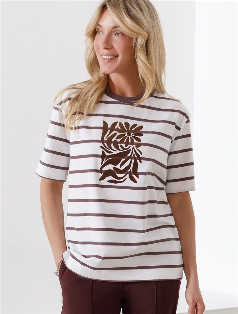 Плотность: 170 Г/м2 Модная футболка белого цвета в широкую горизонтальную полоску кофейного цвета привлекает внимание своим интересным дизайном и ярким принтом. Благодаря прямому крою изделие комфортно садится на любую фигуру, в том числе на большие размеры, и не сковывает движений. Круглый вырез подчеркивает современный стиль, а натуральный материал плотностью 170 Г/м2 из хлопка с добавлением эластана обеспечивает удобство в повседневной носке и приятные тактильные ощущения. Прочность и износостойкая структура позволяют сохранять свежий внешний вид после множества стирок. Принт в виде цветка нанесен красками с устойчивым покрытием. Стильная футболка гармонично вписывается в любой гардероб и подойдет для прогулок, отдыха или неформальных встреч. Благодаря особенностям кроя модель хорошо сидит, скрывая недостатки и подчеркивая достоинства. Яркая футболка идеально сочетается с базовыми вещами, позволяя создавать новые интересные образы каждый день. Комментарии к товару
