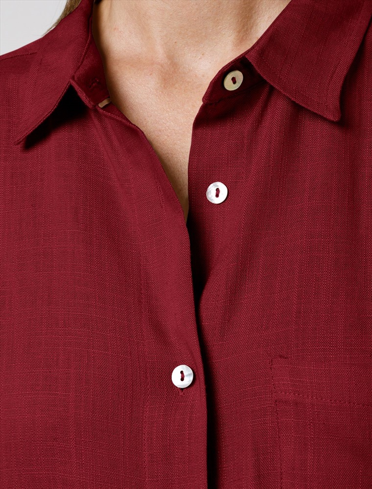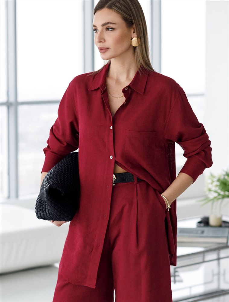 Свободная удлиненная блузка с карманом гранатового цвета изо льна с вискозой, плотностью 200 Г/м2 - идеальный вариант для весны и лета. Сочетание льна и вискозы обеспечивает комфорт и прохладу в жаркие дни. Материал хорошо драпируется и мягко прилегает к фигуре, создавая струящиеся складки. Эта эффектная блузка сочетает в себе современный крой, удобство и стиль. Отложной воротник придает образу элегантность, спущенная линия плеча — модный и расслабленный акцент, а удлиненный крой создает красивый и легкий силуэт. Пуговицы по всей длине делают льняную рубашку особенно практичной, вы можете носить ее растегнутой, в качестве верхнего слоя. Длинная рубашка отлично подойдет на высокий рост, а так же на большие размеры, поможет скрыть возможные недостатки и сохранит при этом стильный образ. Легкая блузка подходит для повседневного гардероба, смотрится красиво, обеспечивая максимальный комфорт.