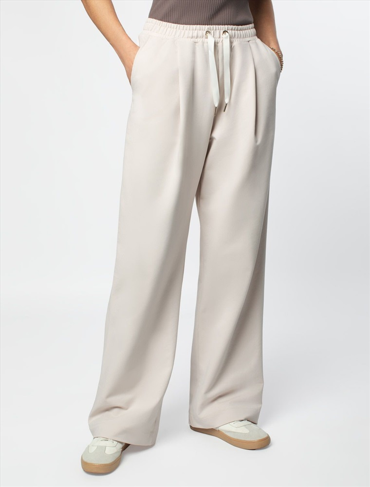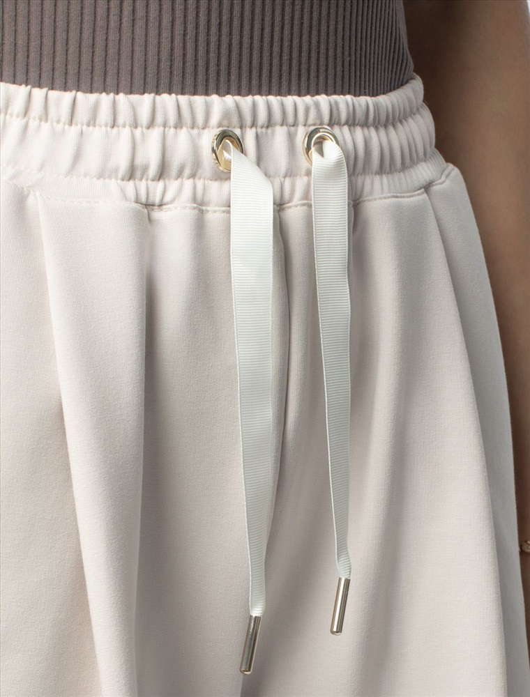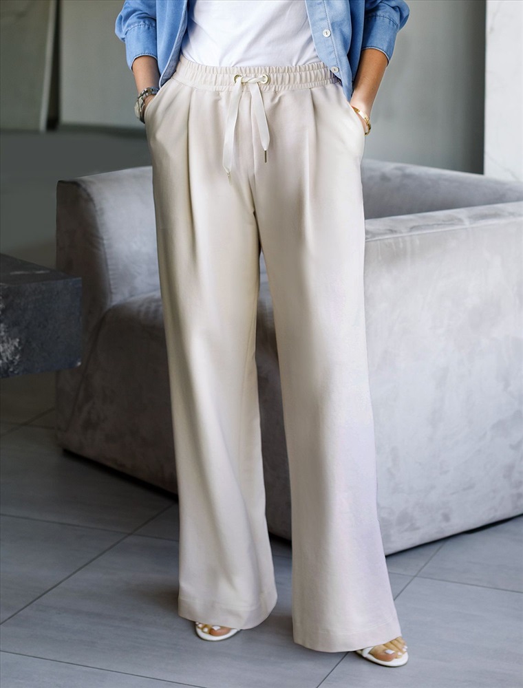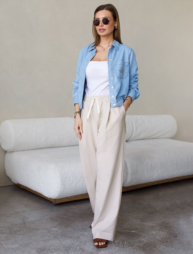 Плотность: 260 Г/м2 Параметры модели на первом фото: Рост 170, бюст 89, талия 63, бедра 92 Брюки свободного кроя выполнены из эластичного футера-двухнитки. Модель дополнена защипами и боковыми карманами как у классических брюк и одним задним карманом. Эластичный пояс на резинке с шнурком из репсовой ленты и металлической фурнитурой. Брюки сочетаются в костюме с футболкой D49.031, D49.085, бомбером D49.038 и паркой D49.075 Комментарии к товару