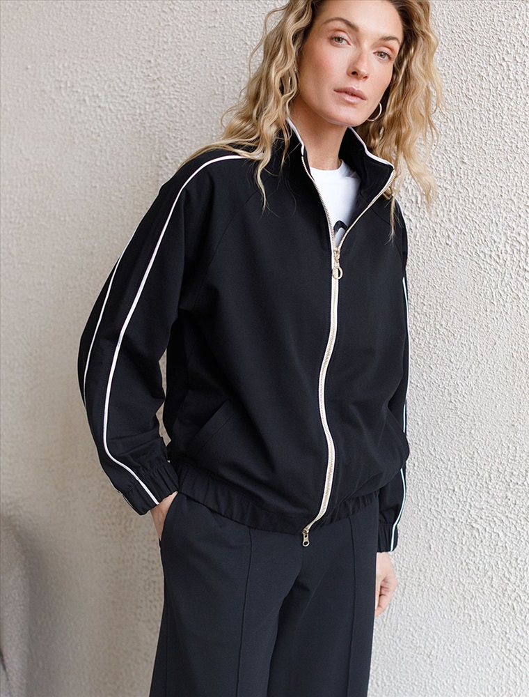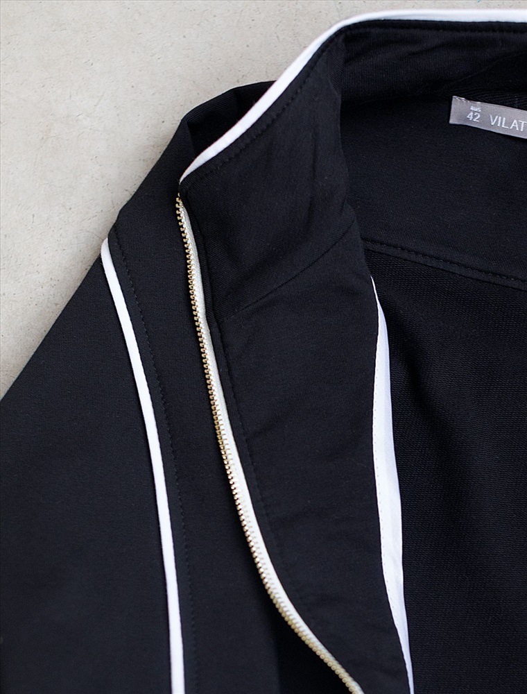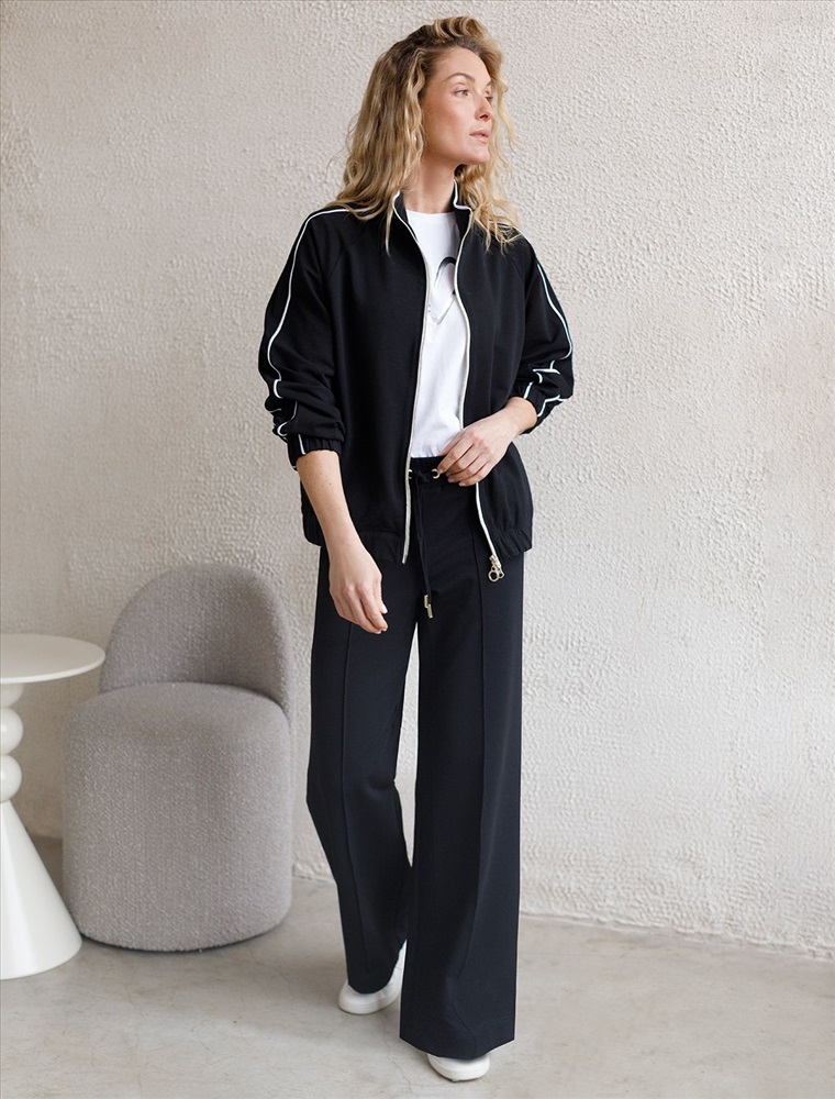 Свободный бомбер черного цвета на молнии выполнен из премиального футера двухнитки плотностью 240 Г/м2. Натуральный состав обеспечивает хорошую воздухопроницаемость, мягкость и приятные тактильные ощущения, Эластичный материал олимпийки позволяет свободно двигаться без лишнего стеснения, а также отлично сохраняет форму даже после длительного ношения. Манжеты на рукавах и резинка по низу обеспечивают надежную посадку, сохраняя тепло в прохладную погоду. Повседневный бомбер отличается универсальной длиной, которая идеально подходит для повседневного и спортивного образа. Контрастные лампасы на рукавах придают образу динамику и визуально вытягивают силуэт, делая модель актуальной. Прорезные карманы по бокам добавляют функциональности, сохраняя при этом стильный внешний вид. Представленная размерная линейка позволяет подобрать оптимальный вариант для любой фигуры и размера, на маленький или плюс сайз, обеспечивая идеальную посадку без компромиссов по стилю. Эта зипка на молнии станет отличным дополнением к базовому гардеробу, сочетая практичность с элегантностью.