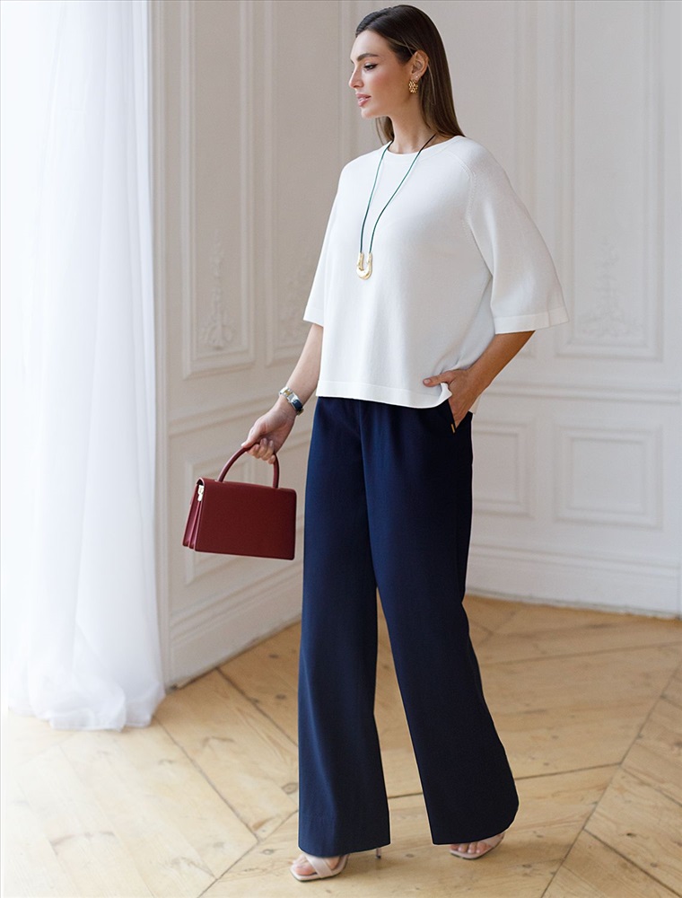 Легкий свободный джемпер белого цвета с круглым вырезом идеально подходит на весну и лето. Тонкая вязка из вискозы дарит приятный комфорт и ощущение свежести в теплую погоду. Универсальная длина позволяет сочетать джемпер с разными элементами гардероба. Джемпер отлично смотрится на больших размерах благодаря продуманному крою и свободному фасону. Широкие рукава создают воздушность и делают силуэт особенно женственным. Этот джемпер с рукавом 3/4 станет незаменимой частью гардероба в сезоны, когда хочется легкости и элегантности одновременно. Лаконичный дизайн обеспечивает простоту комбинирования с другими вещами и будет универсальной базой для создания разнообразных комплектов — от офисного до непринужденного городского стиля.