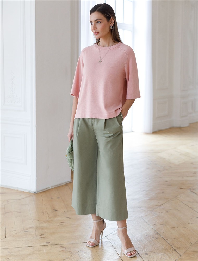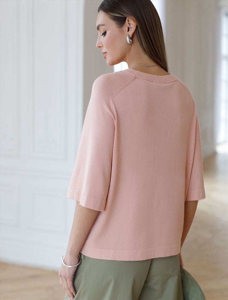 Легкий свободный джемпер светло-розового цвета с круглым вырезом идеально подходит на весну и лето. Тонкая вязка из вискозы дарит приятный комфорт и ощущение свежести в теплую погоду. Универсальная длина позволяет сочетать джемпер с разными элементами гардероба. Джемпер отлично смотрится на больших размерах благодаря продуманному крою и свободному фасону. Широкие рукава создают воздушность и делают силуэт особенно женственным. Этот джемпер с рукавом 3/4 станет незаменимой частью гардероба в сезоны, когда хочется легкости и элегантности одновременно. Лаконичный дизайн обеспечивает простоту комбинирования с другими вещами и будет универсальной базой для создания разнообразных комплектов — от офисного до непринужденного городского стиля.