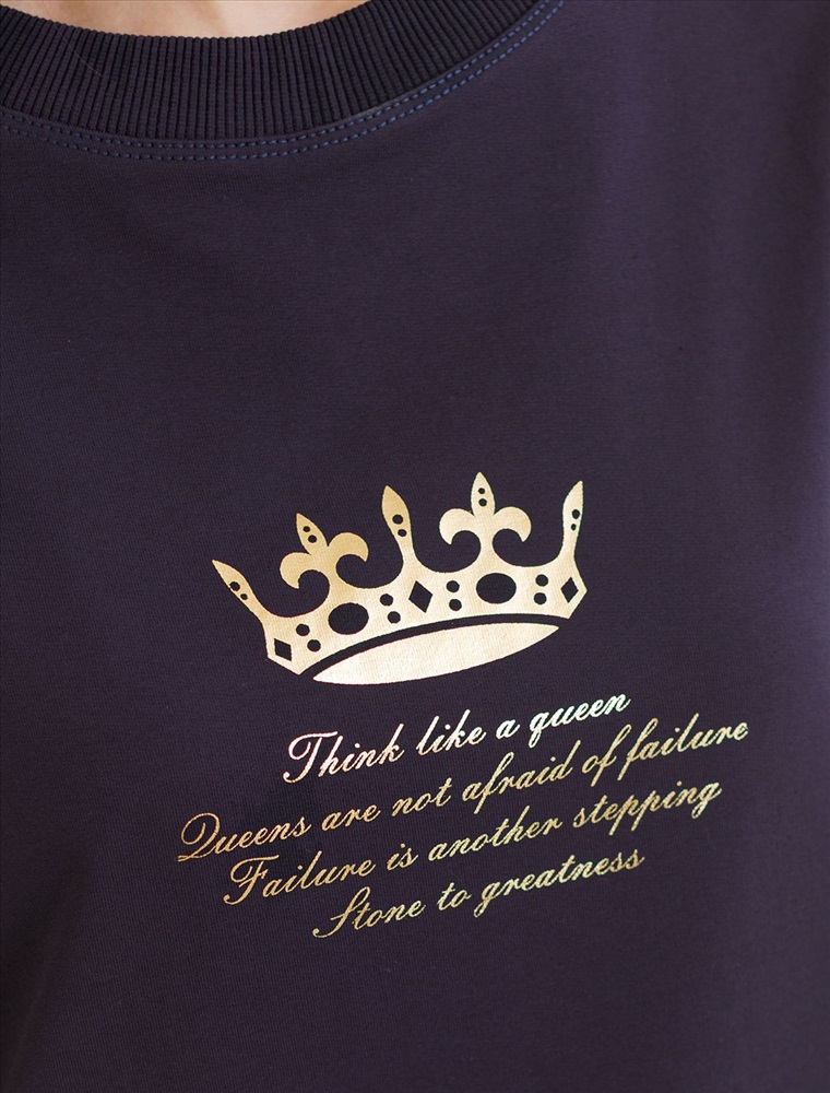 Плотность: 240 Г/м2 Стильный свитшот темно-синего цвета из премиального футера двухнитки с эластаном сочетает в себе комфорт и оригинальность. Джемпер выполнен из натурального хлопка, который обеспечивает мягкость и дышащие свойства ткани. Нежный материал дарит ощущение уюта в любое время года, а премиальное качество изготовления гарантирует долговечность и сохранение формы после множества стирок. Особенность изделия — спущенная линия плеча и аккуратные разрезы, которые добавляют современный акцент и делают образ более выразительным. Принт в виде надписи придает индивидуальность, позволяя выделиться без лишней вычурности. Перевод надписиThink like queen Queens are not afraid of failure Failure is another stepping Stone to greatness - Думай как королева Королевы не боятся неудач Неудача — это ещё один шаг К величию. Дополнен металлическим логотипом бренда. Представлена широкая размерная линейка, включая маленькие и большие размеры, что позволяет подобрать идеальный вариант для разной фигуры и роста. Этот уютный свитшот отлично подходит для повседневной носки благодаря своей комфортной посадке и мягкой текстуре. Он станет универсальным элементом гардероба, легко сочетающимся с различными стилями одежды. Свободный джемпер из футера станет отличным выбором для активного отдыха, обеспечивая стильный внешний вид и удобство весной, летом или в прохладную погоду. Рекомендуем сочетать с артикулами: D44.166, D44.135 Комментарии к товару
