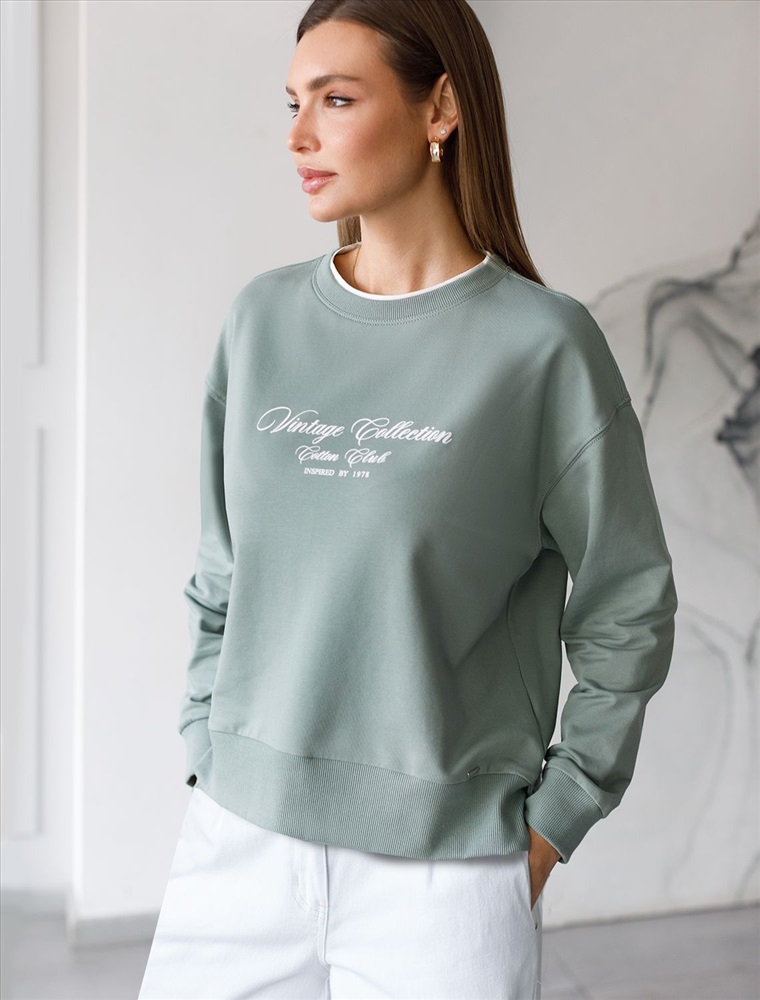 Стильный свитшот светло-оливкового цвета из премиального футера двухнитки с эластаном сочетает в себе комфорт и оригинальность. Джемпер выполнен из натурального хлопка, который обеспечивает мягкость и дышащие свойства ткани. Нежный материал дарит ощущение уюта в любое время года, а премиальное качество изготовления гарантирует долговечность и сохранение формы после множества стирок. Особенность изделия — спущенная линия плеча и аккуратные разрезы, которые добавляют современный акцент и делают образ более выразительным. Эффект имитации футболки в виде белой отделки на вороте делает дизайн динамичным и повышает градус стиля. Принт в виде надписи придает индивидуальность, позволяя выделиться без лишней вычурности. Перевод надписи Vintage collection Cotton club Inspired by 1978 - Винтажная коллекция Cotton Club, вдохновленная 1978 годом. Дополнен металлическим логотипом бренда. Представлена широкая размерная линейка, включая маленькие и большие размеры, что позволяет подобрать идеальный вариант для разной фигуры и роста. Этот уютный свитшот отлично подходит для повседневной носки благодаря своей комфортной посадке и мягкой текстуре. Он станет универсальным элементом гардероба, легко сочетающимся с различными стилями одежды. Свободный джемпер из футера станет отличным выбором для активного отдыха, обеспечивая стильный внешний вид и удобство весной, летом или в прохладную погоду.
