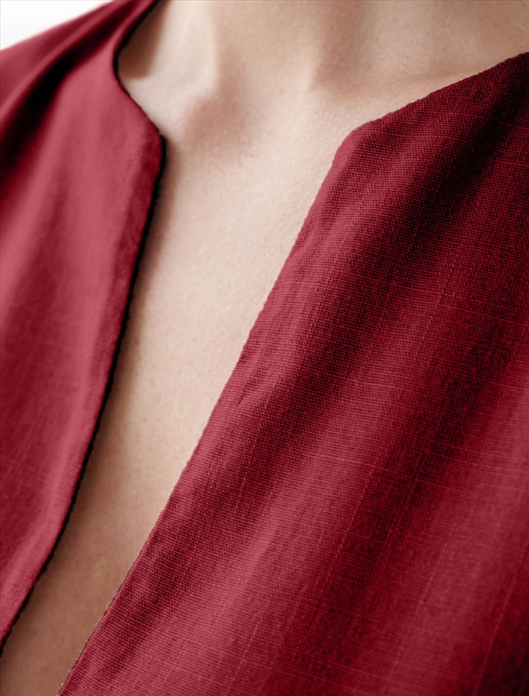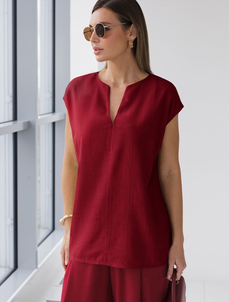 Плотность: 200 Г/м2 Лаконичный топ гранатового цвета без застежек с V-вырезом выполнен изо льна с вискозой, плотносью 200 Г/м2. Сочетание льна и вискозы обеспечивает комфорт и прохладу в жаркие дни. Свободный топ c коротким цельнокроеным рукавом будет идеальным выбором для лета и весны, позволяя ощущать комфорт даже при высокой температуре воздуха. Особенность этого летнего топа — натуральный материал, который хорошо драпируется и мягко прилегает к фигуре, создавая струящиеся складки. Свободный крой топа обеспечивает комфорт, легкость и свободу движений, аккуратное полузакрытое декольте подчеркивает изысканность образа и женственность силуэта. Этот красивый топ подойдет для создания любого стильного повседневного образа, на работу или на важное мероприятие. Рекомендуем сочетать с артикулом: D24.308 Комментарии к товару
