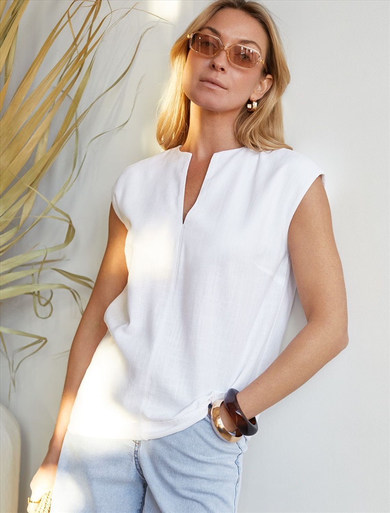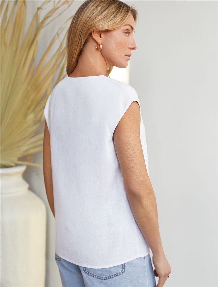 Плотность: 200 Г/м2 Лаконичный топ белого цвета без застежек с V-вырезом выполнен изо льна с вискозой, плотносью 200 Г/м2. Сочетание льна и вискозы обеспечивает комфорт и прохладу в жаркие дни. Свободный топ c коротким цельнокроеным рукавом будет идеальным выбором для лета и весны, позволяя ощущать комфорт даже при высокой температуре воздуха. Особенность этого летнего топа — натуральный материал, который хорошо драпируется и мягко прилегает к фигуре, создавая струящиеся складки. Свободный крой топа обеспечивает комфорт, легкость и свободу движений, аккуратное полузакрытое декольте подчеркивает изысканность образа и женственность силуэта. Этот красивый топ подойдет для создания любого стильного повседневного образа, на работу или на важное мероприятие. Рекомендуем сочетать с артикулом: D24.308 Комментарии к товару