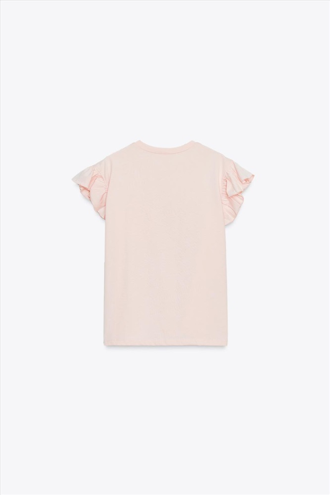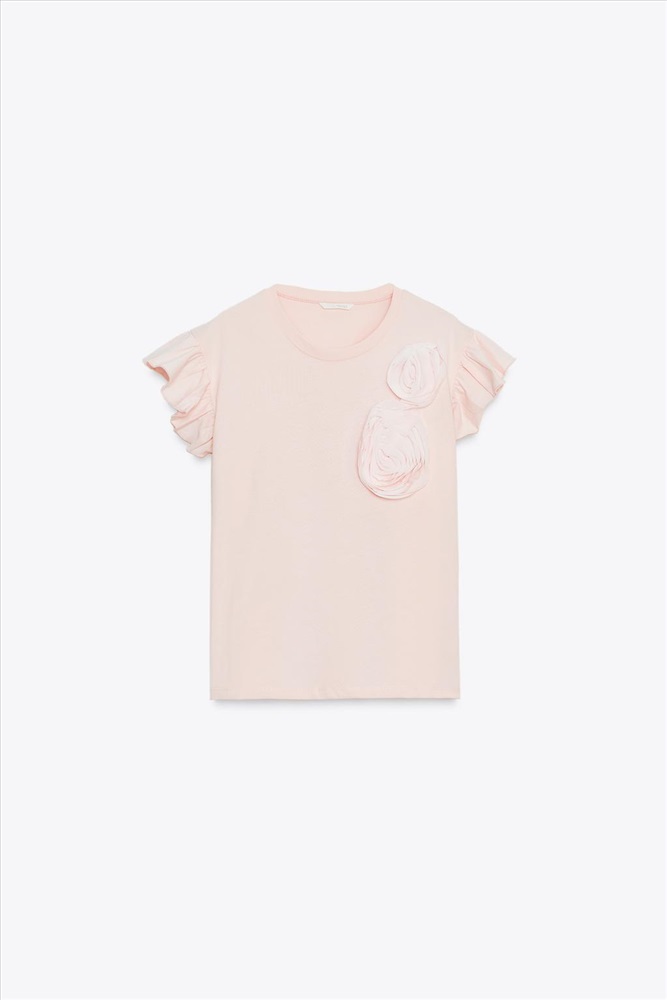 Round neck, short sleeve T-shirt with frills. Featuring raised floral detail.