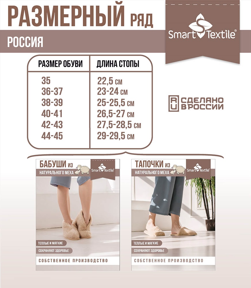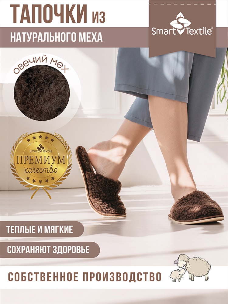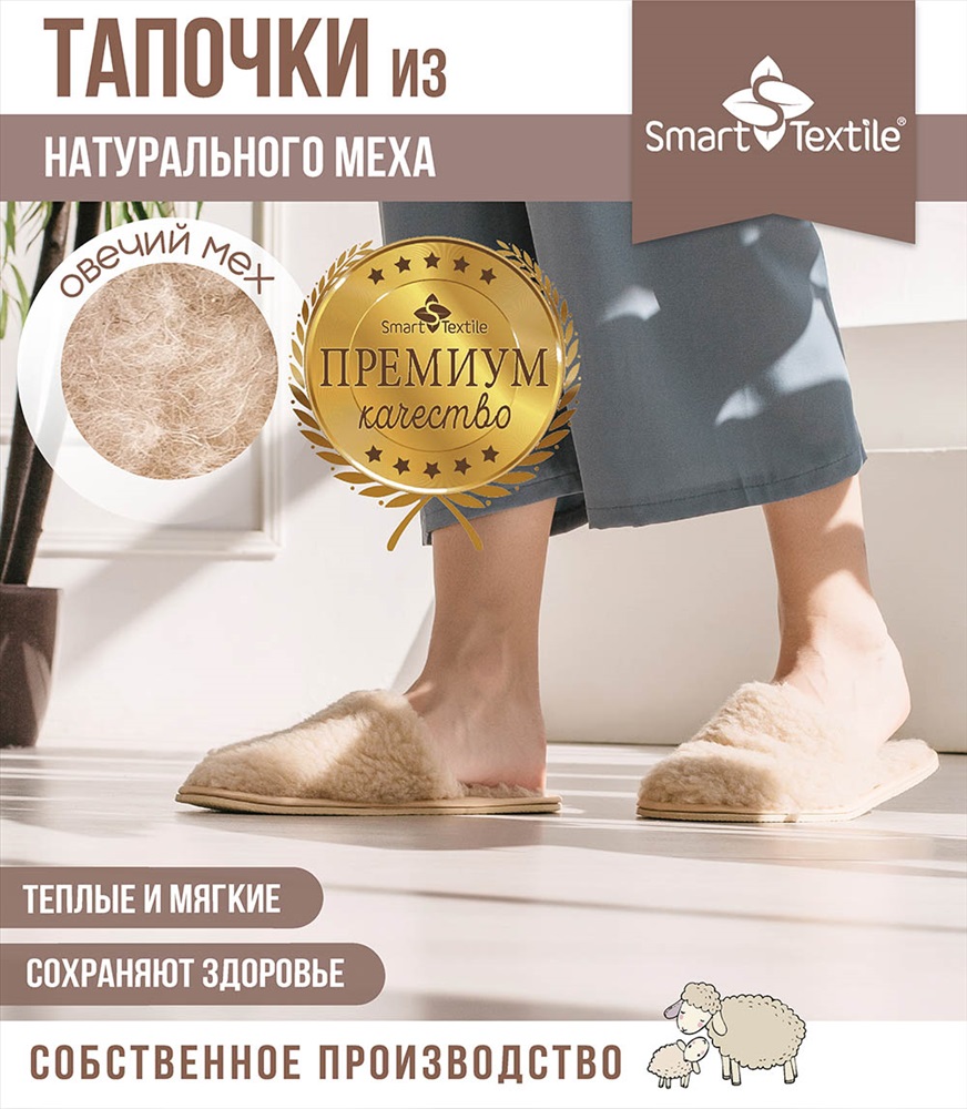 Стиль: домашний Тапочки из натурального овечьего меха Домашнее тепло Идеальный Выбор для Уюта. Тапочки из овечьего меха Домашнее тепло это идеальное решение для тех, кто ценит домашний уют и комфорт. Изготовленные из натурального овечьего меха на трикотажной основе, они обеспечивают непревзойденное тепло и мягкость. Этот гипоаллергенный и дышащий материал идеально подходит для поддержания оптимальной температуры ваших ног в любое время года. Тепло и Комфорт: Овечий мех это непревзойденное решение для ваших ног. Овечий мех обладает уникальной способностью сохранять сухое тепло, что особенно актуально в летний зной и в зимние морозы. В этих тапочках ваши ноги будут в тепле и комфорте при любой температуре. Структура меха способствует улучшению кровообращения, снижению отечности и уменьшению болевых ощущений. Высокая гигроскопичность овечьего меха предотвращает потоотделение и накопление влаги, обеспечивая вашему телу сухой и комфортный микроклимат. Тапочки представлены в трех цветах: бежевом, коричневом и белом, в форме шлепанцев с закрытым носком и без задников. Они легко надеваются и обеспечивают комфорт при использовании.