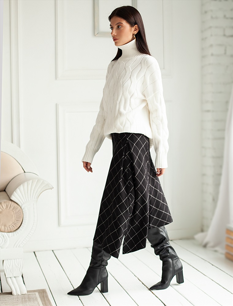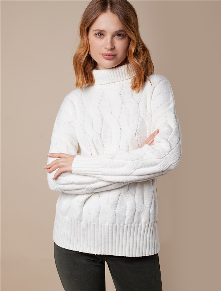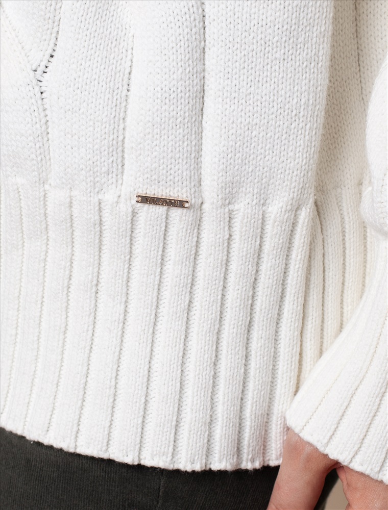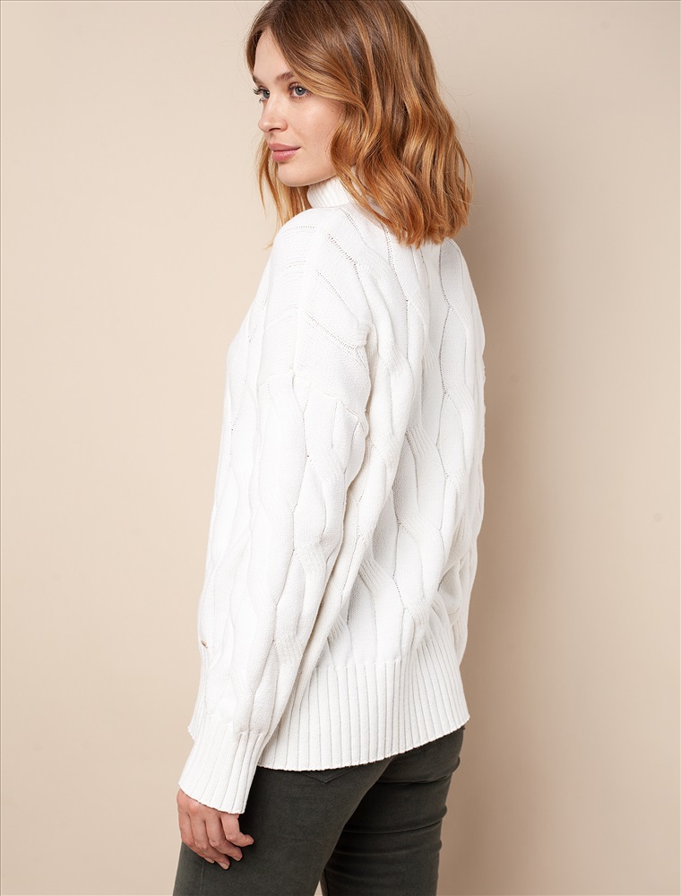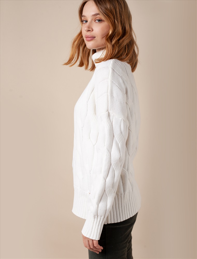 Уютный свитер с крупной вязки с узорами косы выполнен из мягкой хлопковой пряжи с акрилом. Модель абсолютно не колется и очень комфортная в носке даже на голое тело. Отлично согревает при этом не перегревая. Хорошо сочетается с брюками из эко-кожи и джинсами на флике, вельветом.