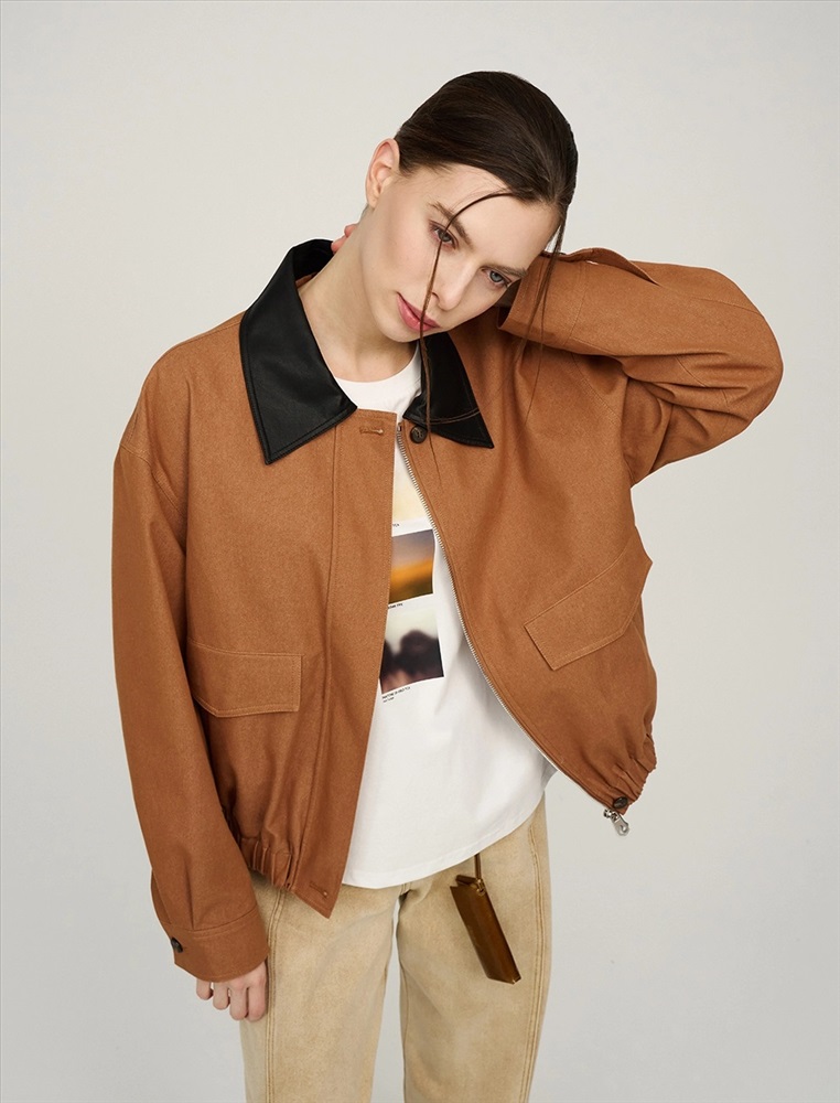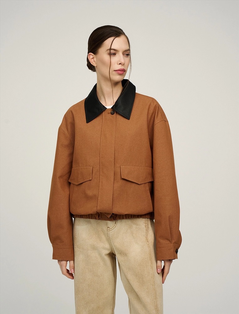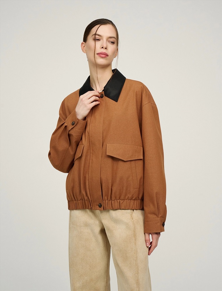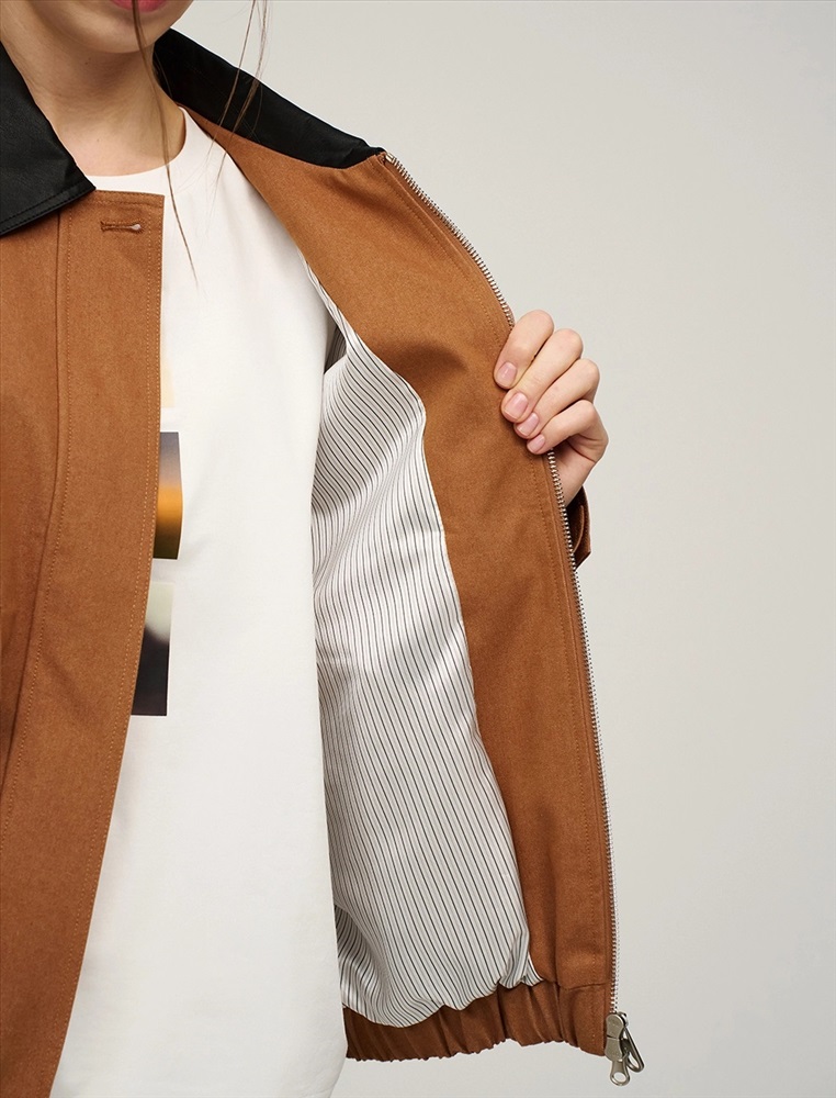 Бомбер с отложным воротник из эко-кожи и поясом на резинке. По переду изделия два декоративных кармана с клапаном, два функциональных кармана и застежка на пуговицы и двустороннюю молнию. Длинные рукава с манжетами на пуговицах. По спинке изделия отрезная кокетка и петелька. Бомбер выполнен в терракотовом цвете в смесовой хлопковой ткани на подкладке в полоску.