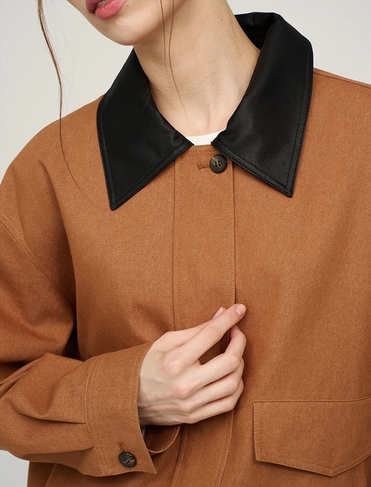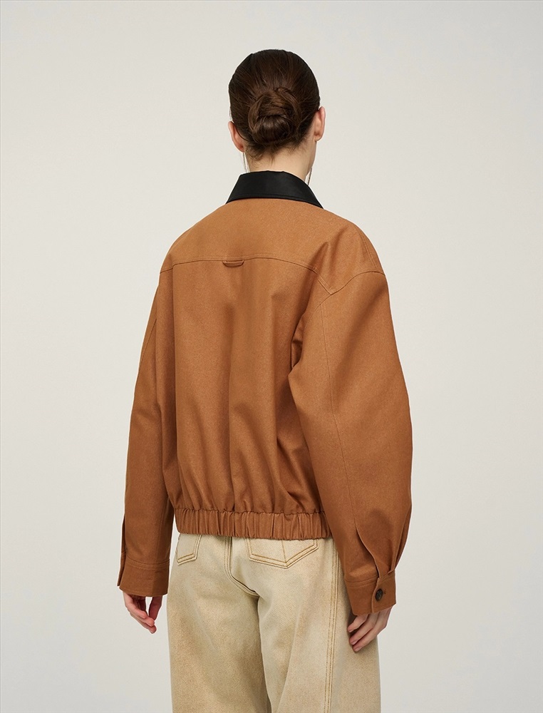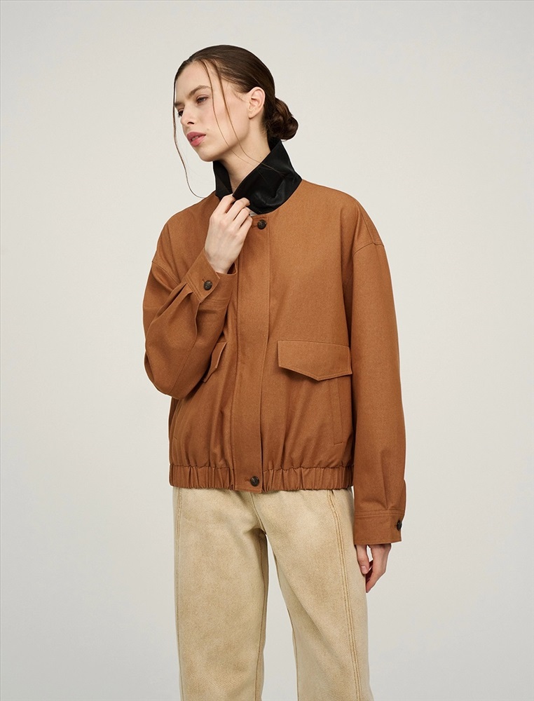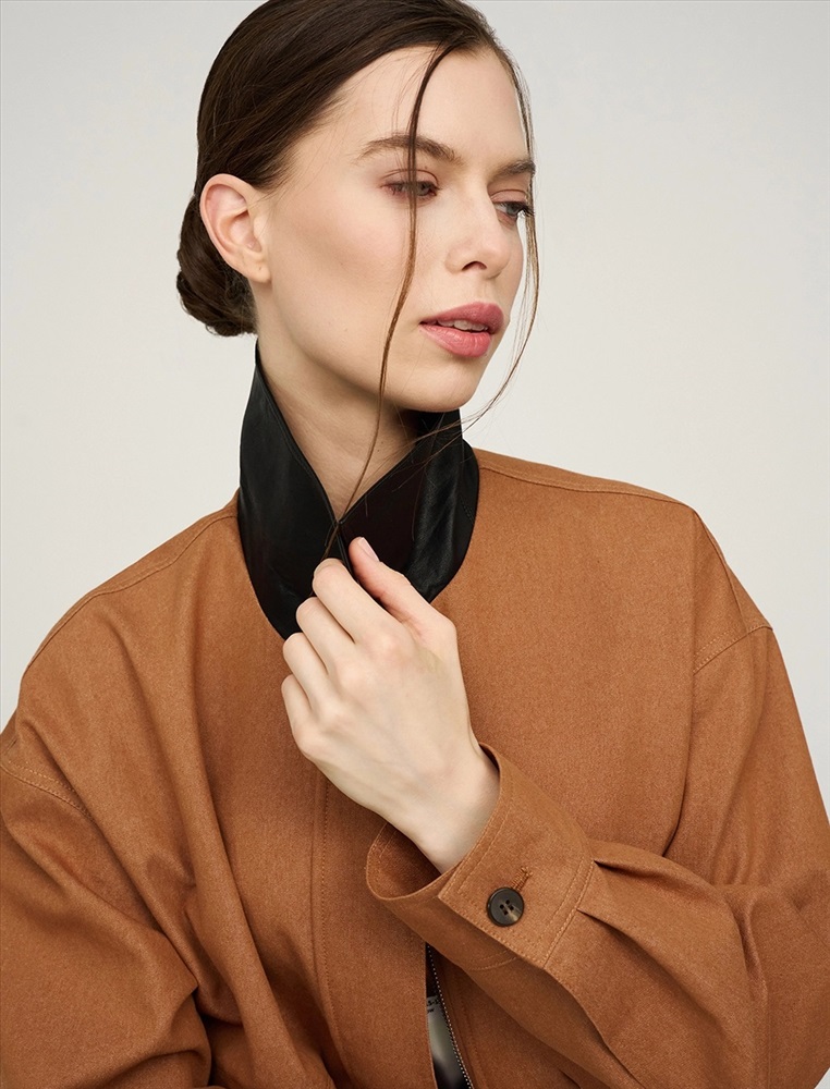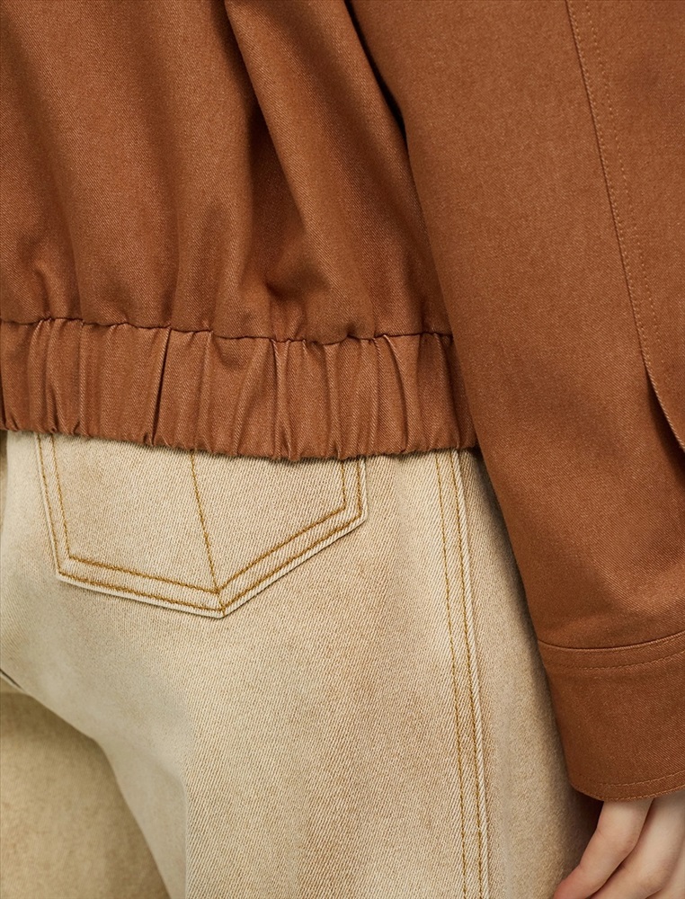 Бомбер с отложным воротник из эко-кожи и поясом на резинке. По переду изделия два декоративных кармана с клапаном, два функциональных кармана и застежка на пуговицы и двустороннюю молнию. Длинные рукава с манжетами на пуговицах. По спинке изделия отрезная кокетка и петелька. Бомбер выполнен в терракотовом цвете в смесовой хлопковой ткани на подкладке в полоску.