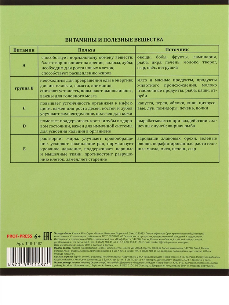 Модель: Тетрадь КЛЕТКА 48л. БИОЛОГИЯ «МАНГА» (Т48-1487) стандарт, твин-лак Тип товара: тетрадь Бренд: Проф-прес Стиль: для школы На протяжении всего обучения в школе главным помощником для ученика является тетрадь! Новая серия Манга это серия из 16 предметных тетрадей, которая представляет собой микс трендов: дерзких аниме-героев и харизматичных животных. Тетради имеют необычное сочетание актуальных дизайнов, которое придает этой серии выразительный характер. Внутри расположен справочный материал с подсказками по соответствующему школьному предмету. Обложка: мелованный целлюлозный картон, твин-лак. Внутренний блок: офсет 60 г/м 100 % белизны, 48 листов. Линовка: клетка. Таблица размеров и веса