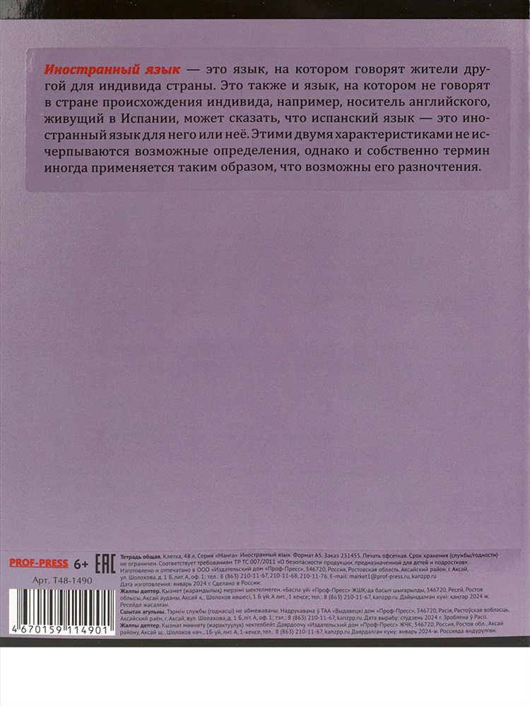 Модель: Тетрадь КЛЕТКА 48л. ИНОСТРАННЫЙ ЯЗЫК «МАНГА» (Т48-1490) стандарт, твин-лак Тип товара: тетрадь Бренд: Проф-прес Стиль: для школы На протяжении всего обучения в школе главным помощником для ученика является тетрадь! Новая серия Манга это серия из 16 предметных тетрадей, которая представляет собой микс трендов: дерзких аниме-героев и харизматичных животных. Тетради имеют необычное сочетание актуальных дизайнов, которое придает этой серии выразительный характер. Внутри расположен справочный материал с подсказками по соответствующему школьному предмету. Обложка: мелованный целлюлозный картон, твин-лак. Внутренний блок: офсет 60 г/м 100 % белизны, 48 листов. Линовка: клетка. Таблица размеров и веса