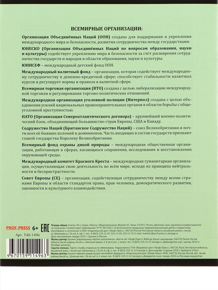 Модель: Тетрадь Тетрадь КЛЕТКА 48л. ОБЩЕСТВОЗНАНИЕ «МАНГА» (Т48-1496) стандарт, твин-лак Тип товара: тетрадь Бренд: Проф-прес Стиль: для школы На протяжении всего обучения в школе главным помощником для ученика является тетрадь! Новая серия Манга это серия из 16 предметных тетрадей, которая представляет собой микс трендов: дерзких аниме-героев и харизматичных животных. Тетради имеют необычное сочетание актуальных дизайнов, которое придает этой серии выразительный характер. Внутри расположен справочный материал с подсказками по соответствующему школьному предмету. Обложка: мелованный целлюлозный картон, твин-лак. Внутренний блок: офсет 60 г/м 100 % белизны, 48 листов. Линовка: клетка. Таблица размеров и веса