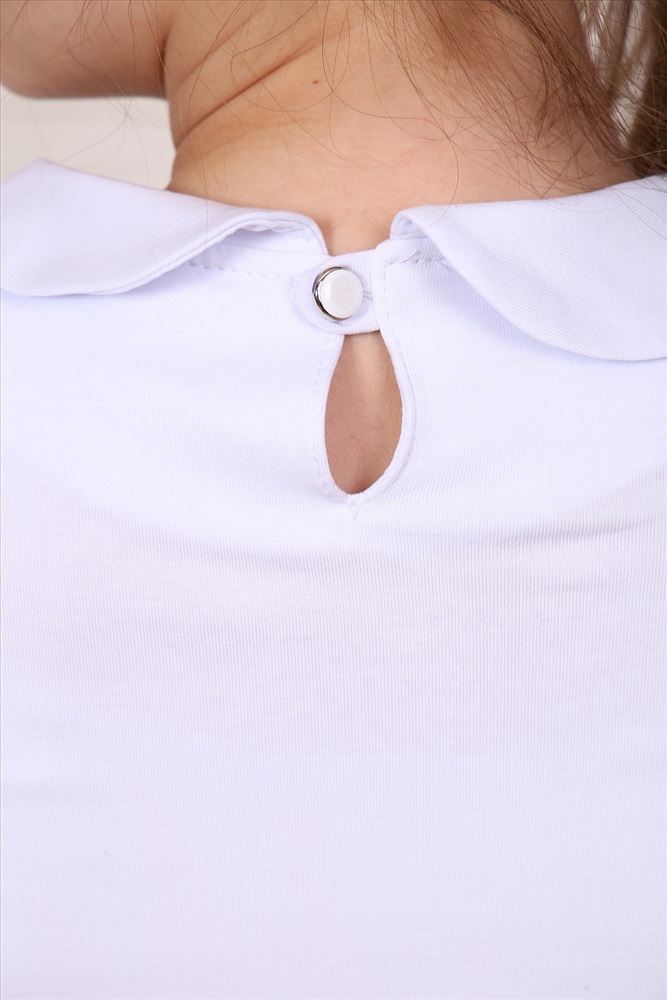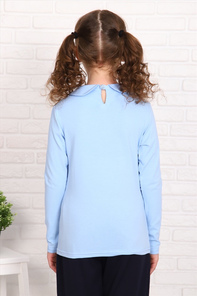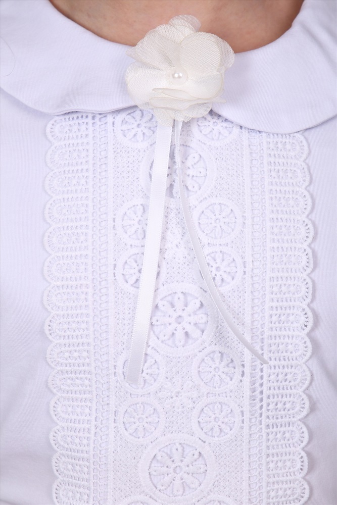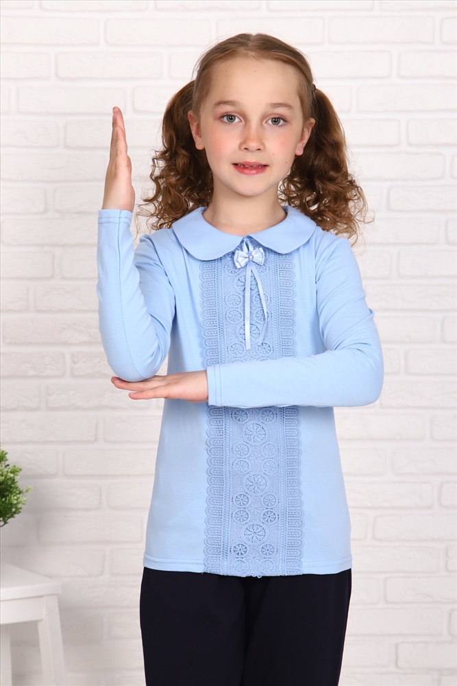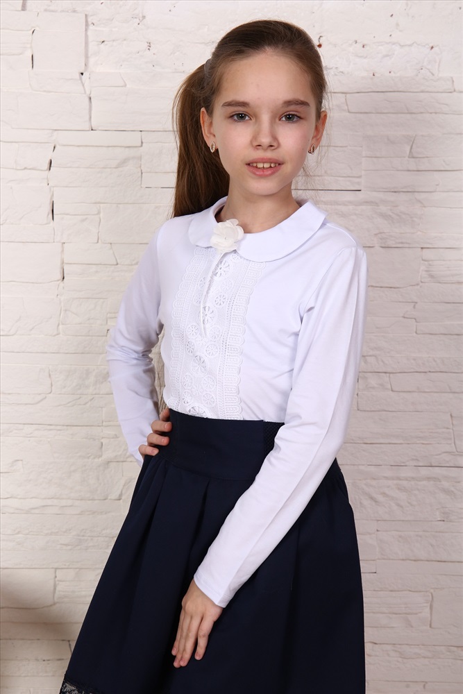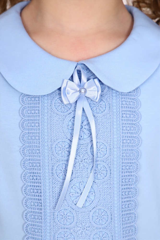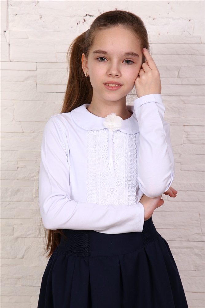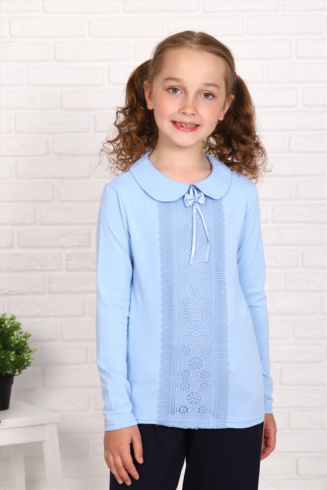 Застежка: пуговицы Блузка для девочек младшего и старшего школьного возраста, из однотонного трикотажного полотна кулирка с лайкрой. Блузка прилегающего силуэта, с втачным рукавом, с воротником, с центральной застежкой на петлю и пуговицу на спинке. Спереди по центру от горловины до низа настрочено кружево. На спинке разрез под застежку. Рукав длинный. Воротник на базе плосколежащего, с концами округлой формы. Горловина переда и спинки с обтачками. По шву втачивания вороника в горловину, по нижнему воротнику и разрезу на спинке проложена отделочная строчка. Низа изделия и рукавов подогнуты. Спереди по центру воротника прикреплен декоративный элемент.