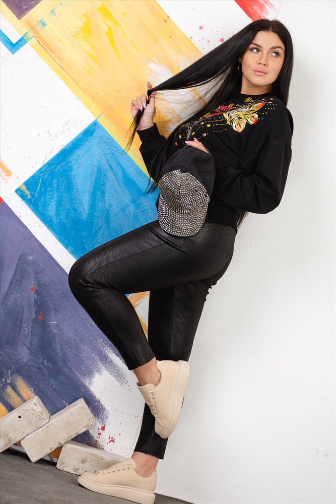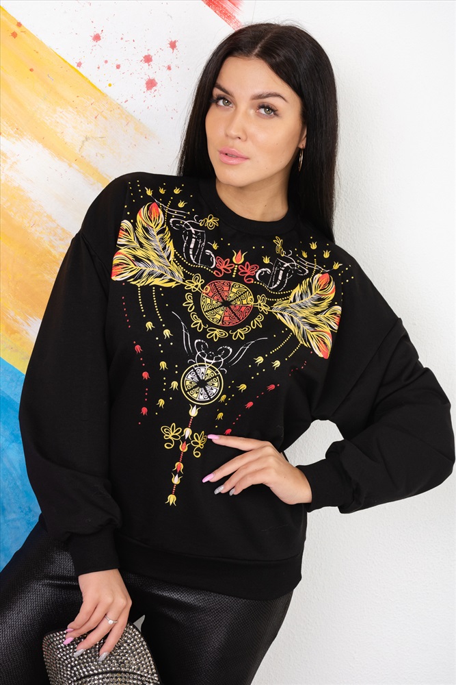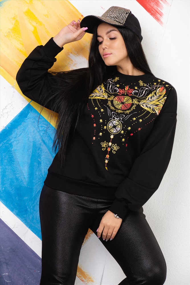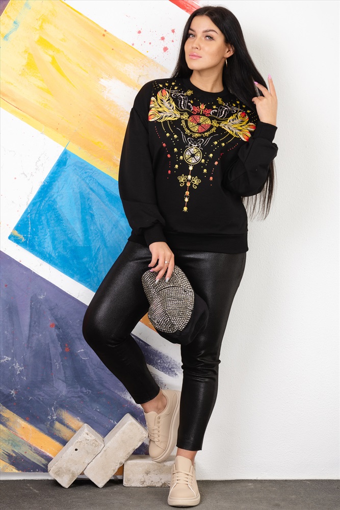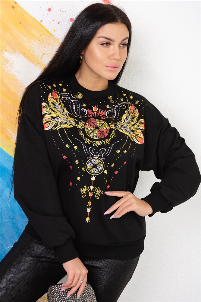 Застежка: без застежки Толстовка свободного кроя с оригинальным принтом в виде орнамента, украшением которого является золотой глиттер. Эта модель хорошо сочетается как с джинсами, так и с брюками и юбками. Горловина, манжеты рукавов и низа изделия изготовлены из плотной, качественной резинки кашкорсе, которая при эксплуатации не растягивается. В характеристиках длина рукава указана от точки основания шеи вместе с манжетой.