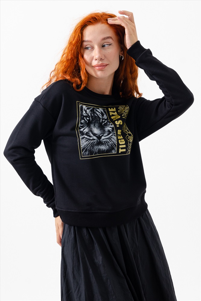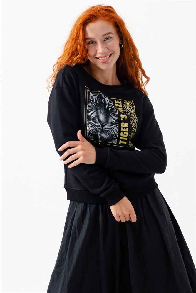 Застежка: без застежки Модная, стильная, удобная толстовка с красивым принтом - Взгляд тигра. Шелкография с золотым глиттером. Благодаря наличию в составе 60% хлопка очень комфортна к телу. Горловина и низ обработаны декоративной строчкой. Шов на горловине спинки закрыт киперной лентой. Длина рукава в измерениях указана от основания шеи. Толстовка предназначена для активного отдыха и повседневной носки.