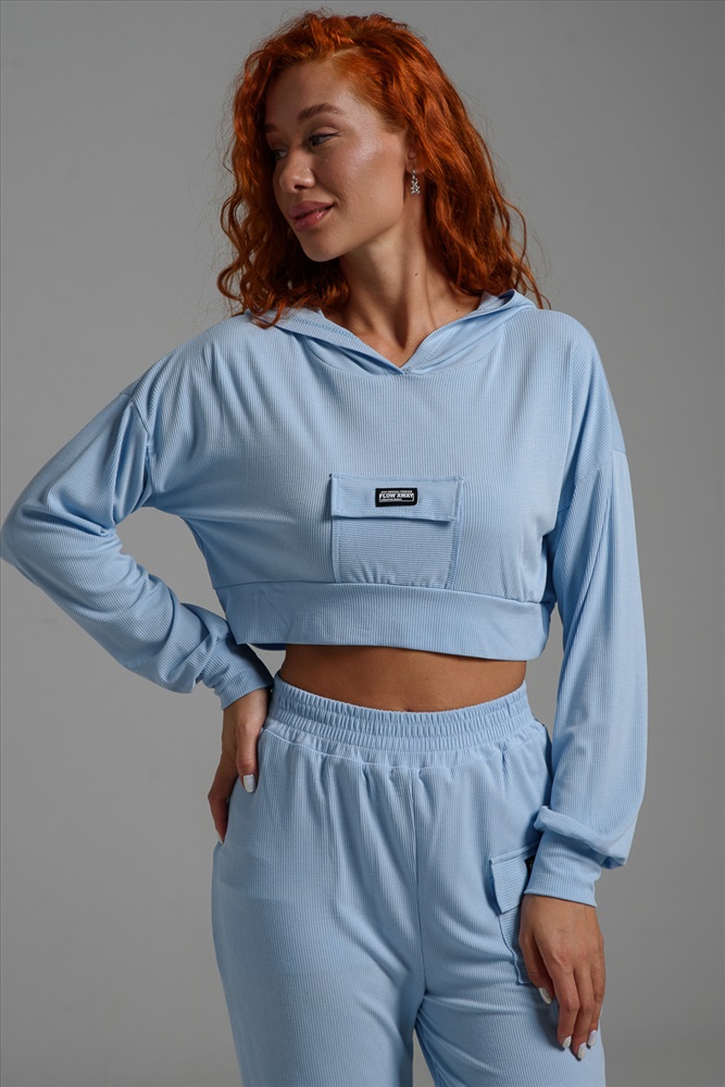 Застежка: без застежки Стильное укороченное худи с капюшоном и длинными рукавами выполнено из очень мягкой приятной к телу ткани в мелкий рубчик. Худи свободного кроя с маленьким кармашком с клапаном на груди. Отлично сочетается с майками, топами, спортивными брюками, шортами, юбками.