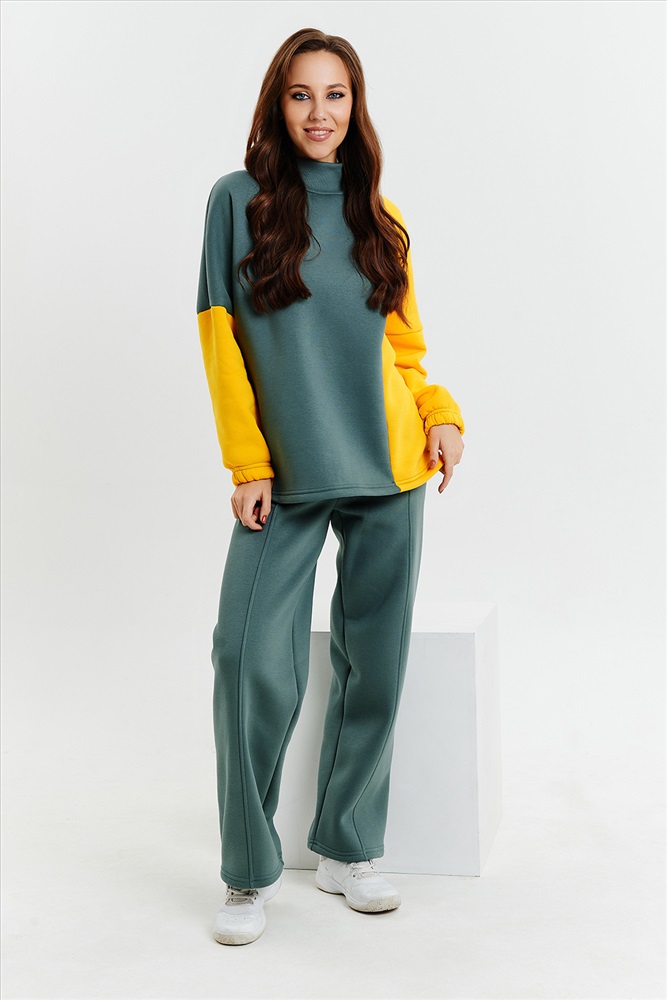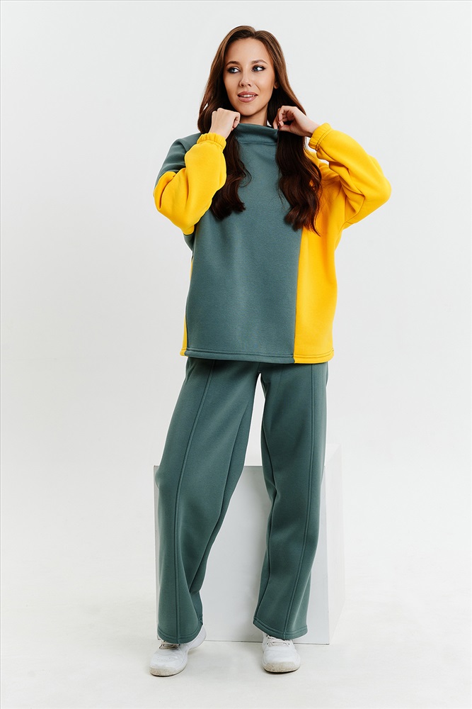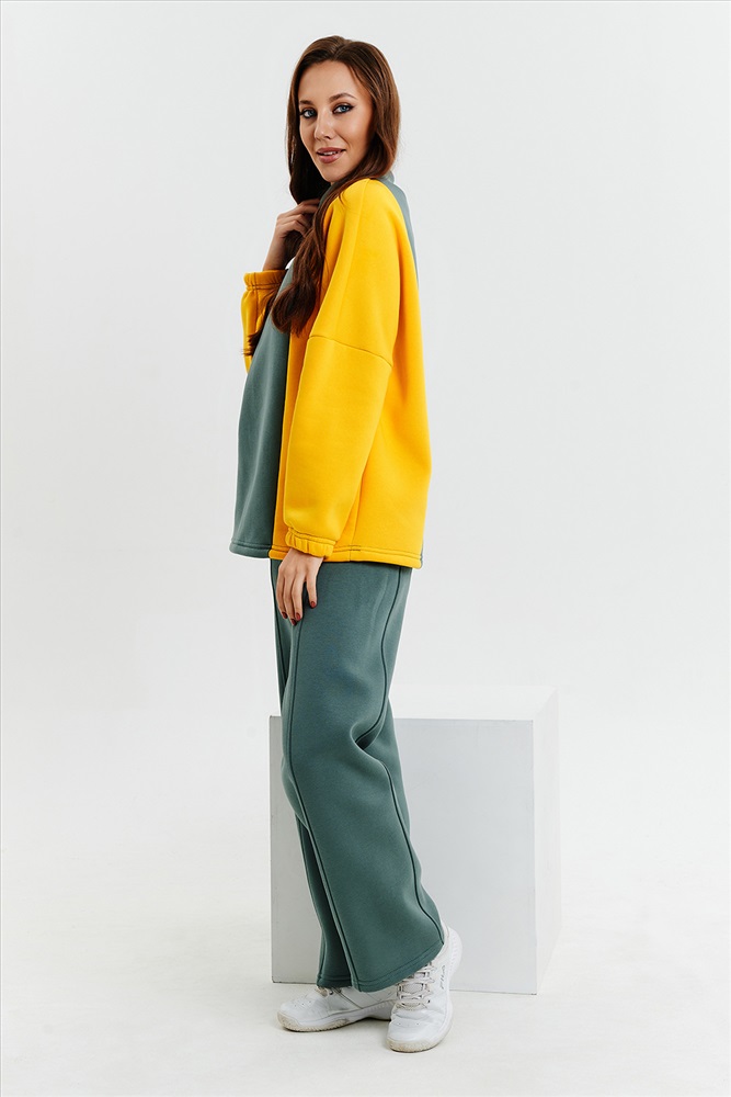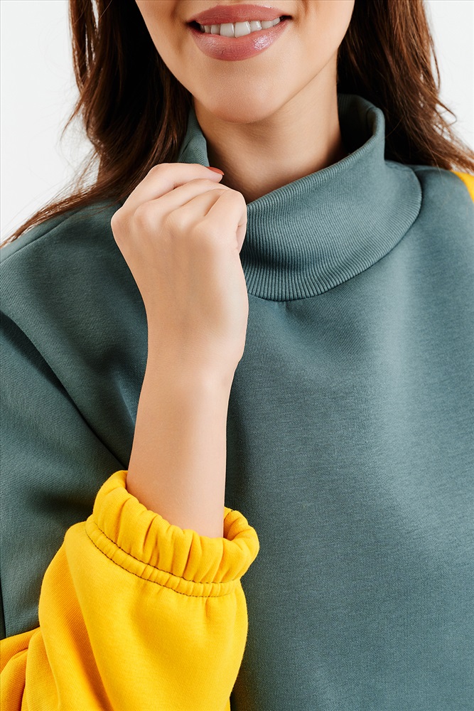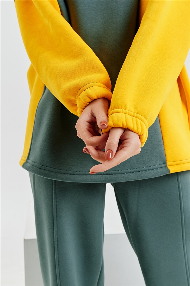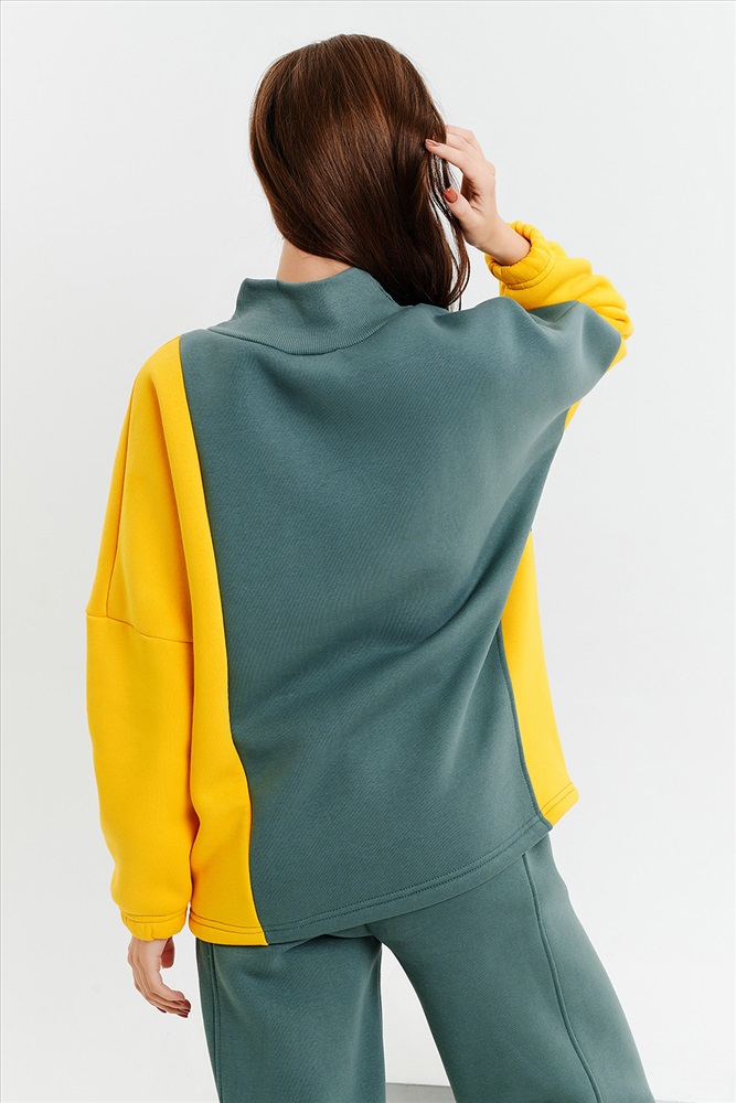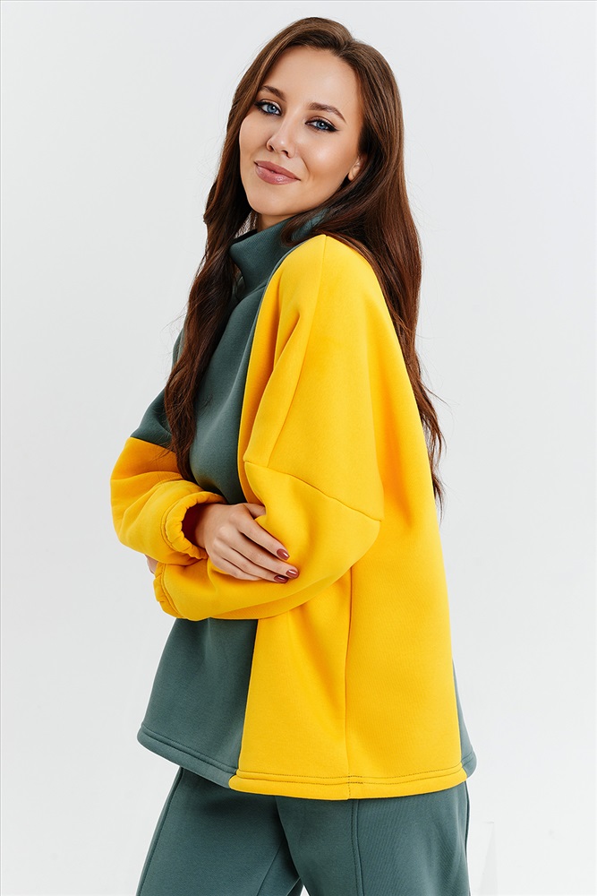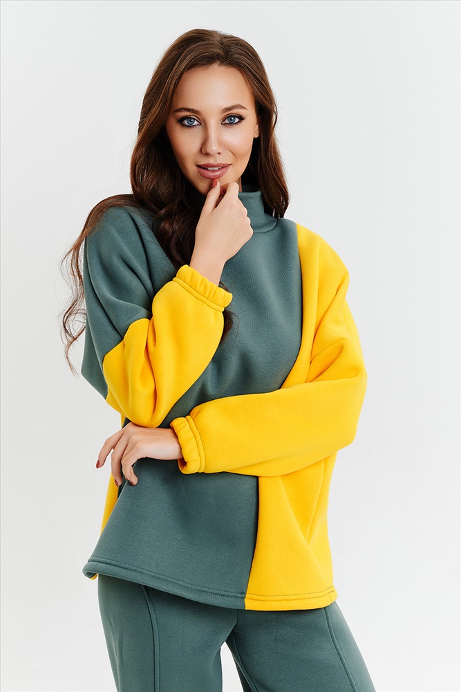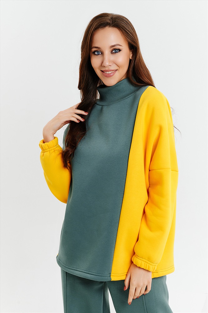Застежка: без застежки Свитшот oversize женский. Материал - футер с начёсом. Сезон - осень-зима. Свитшот выполнен в технике Color Block (цветовые блоки). Модель свободная, объемная, прямого силуэта. Горловина выполнена из кашкорсе. Рукав со спущенной проймой, манжета на резинке. Рукава разного цвета. По бокам полочки - разномасштабные, округлые вставки.