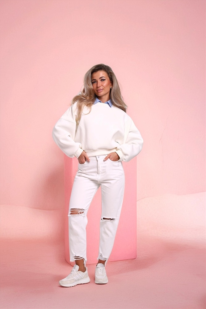 Застежка: без застежки Женская толстовка актуального объема длиной до талии. Рукав реглан широкий, за счет своей ширины, рукав не будет вытягиваться в районе сгиба локтя. Низ рукава и низ толстовки с притачной манжетой и поясом из кашкорсе. Горловина обработана обтачкой из кашкорсе. По краю горловины, проймы и горизонтальным подрезам на рукаве отделочная строчка. Форма рукава реглан и объем толстовки подойдет под любую форму плеча и фигуру, а так же вы смело можете надеть под толстовку, как водолазку, так и классическую рубашку выправив воротничок наружу. Изделие отлично впишется в ваш повседневный гардероб в любой сезон, обеспечит уют и тепло что немаловажно в прохладную погоду. Модель выполнена из гладкокрашеного футера 3-х нитки с начесом. Ткань мягкая, устойчива к истиранию и сминаемости и вы всегда будете иметь аккуратный и ухоженный вид. На фото модель представлена в 46 размере.