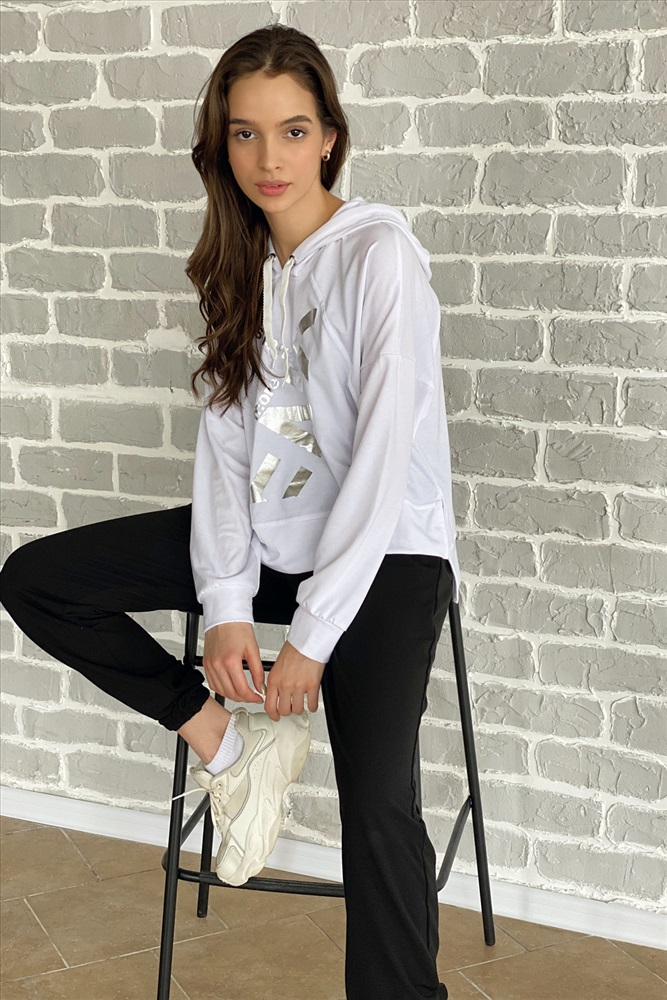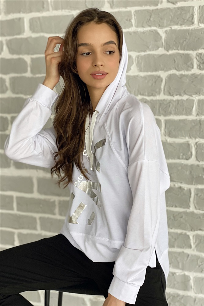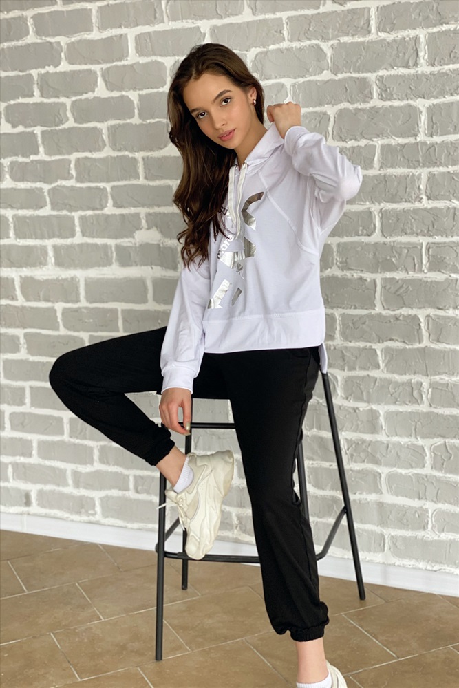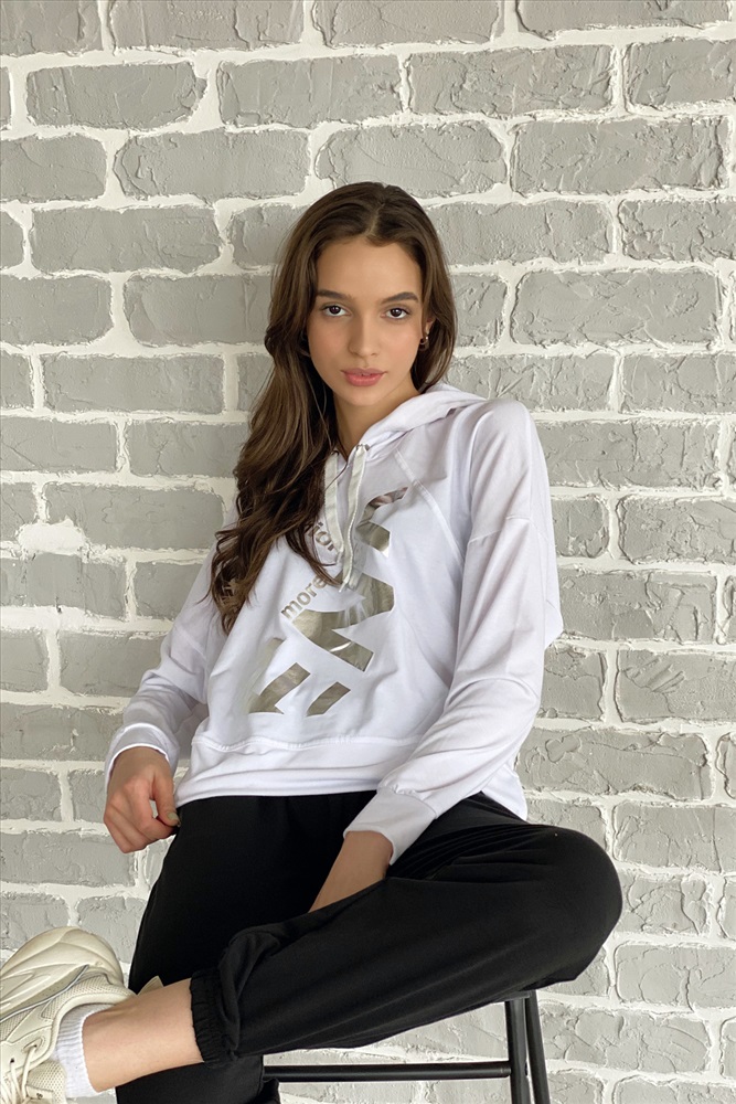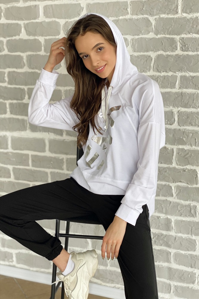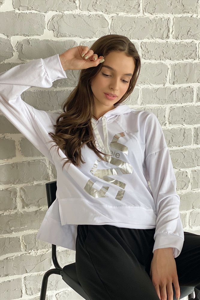 Застежка: без застежки Толстовка прямая, укороченная, с капюшоном, на поясе. Рукав длинный, на манжете. Спинка удлиненная, на поясе. На полочке расположены симметричные кокетки и пояс. В нижней части боковых швов обработаны разрезы.