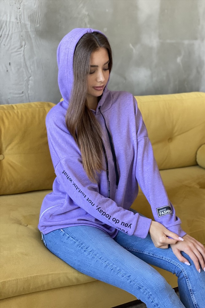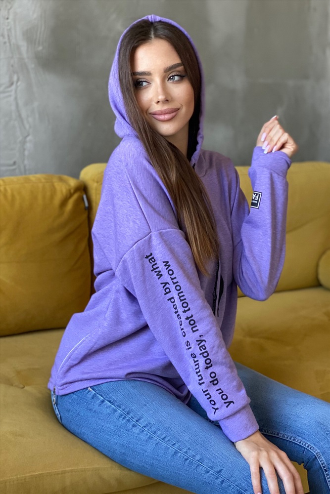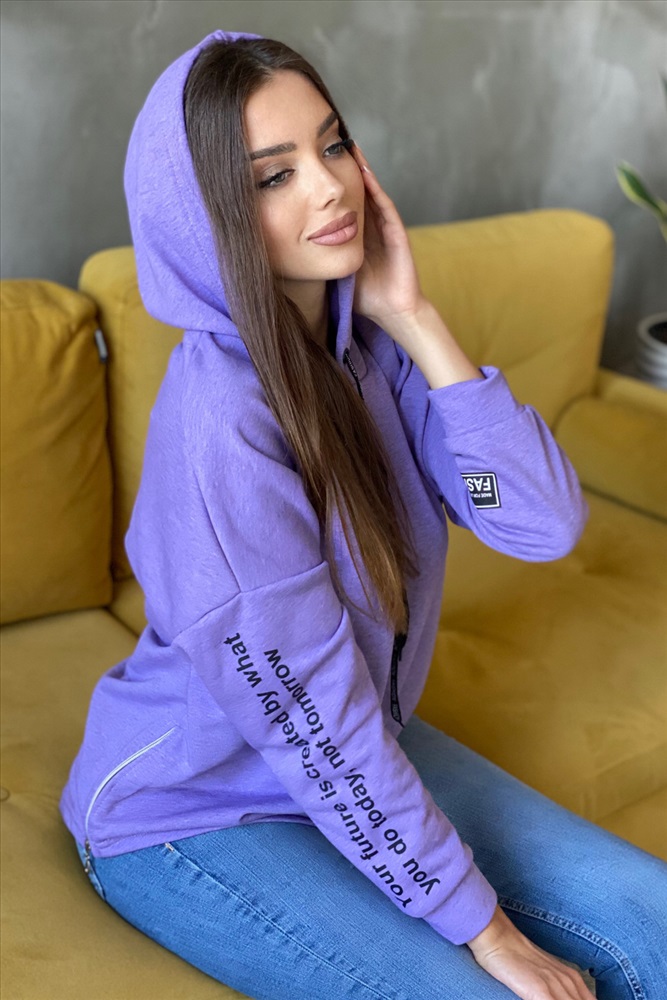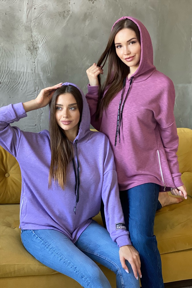Застежка: молния Толстовка прямая, свободная, с капюшоном, с длинным рукавом на манжете. Низ полочки и спинки фигурный. В нижней части боковых швов обработаны молнии.
