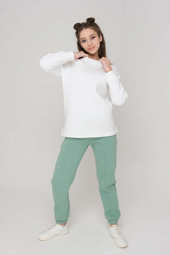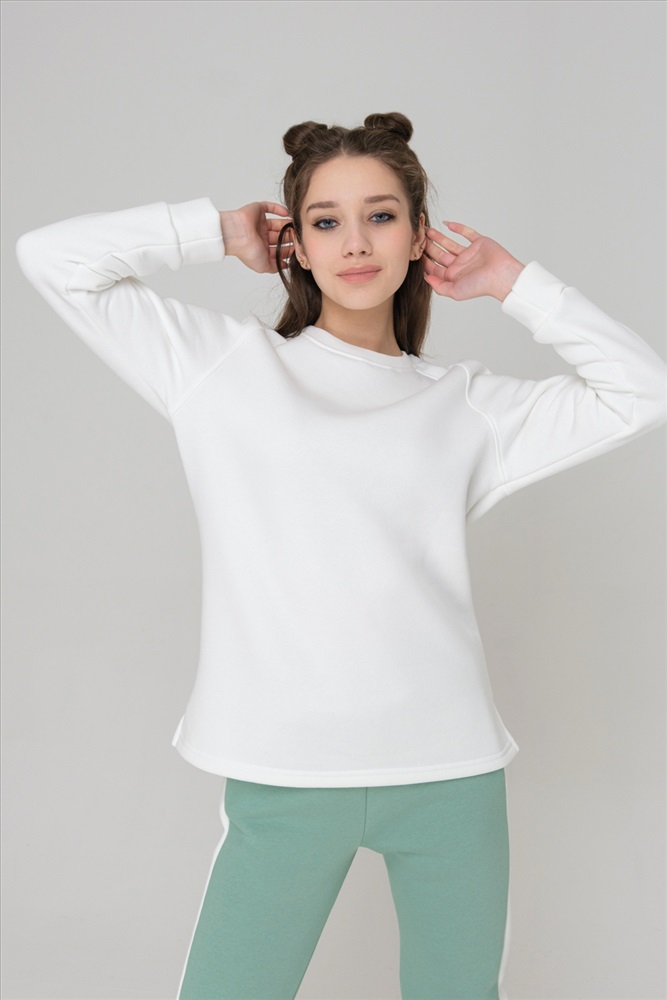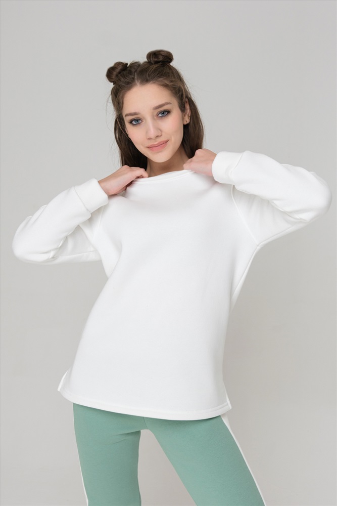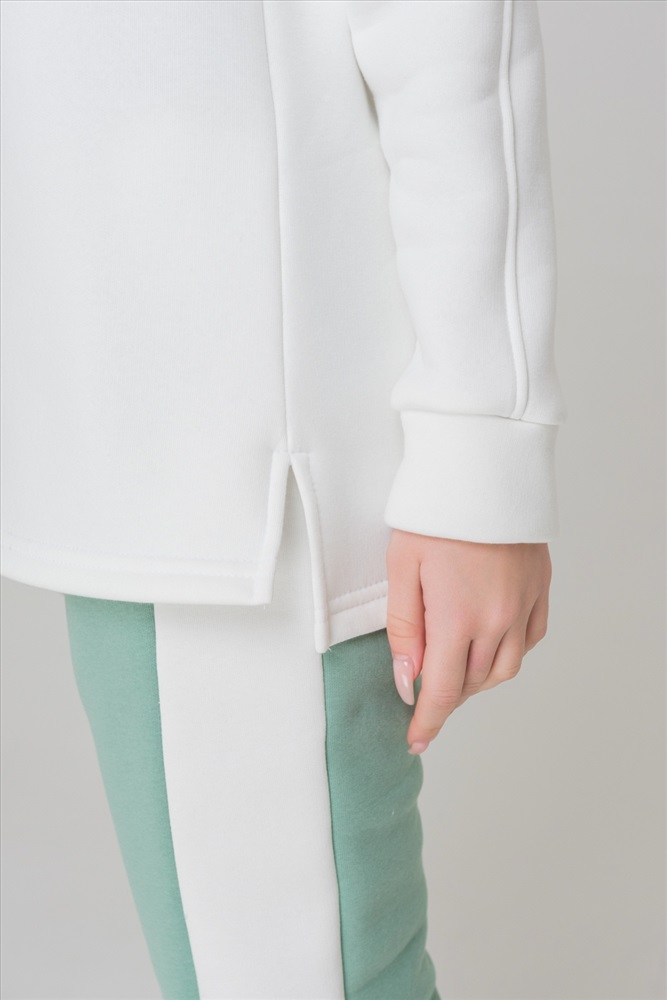 Застежка: без застежки Толстовка утепленная, прямая, с округлой горловиной, с удлиненной спинкой. Рукав реглан, длинный, на манжете. Горловина обработана эластичной обтачкой. В нижней части боковых швов обработаны разрезы.