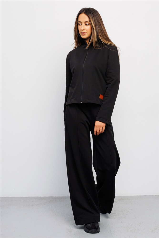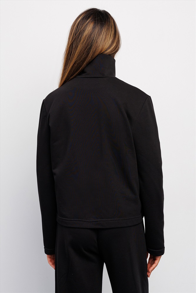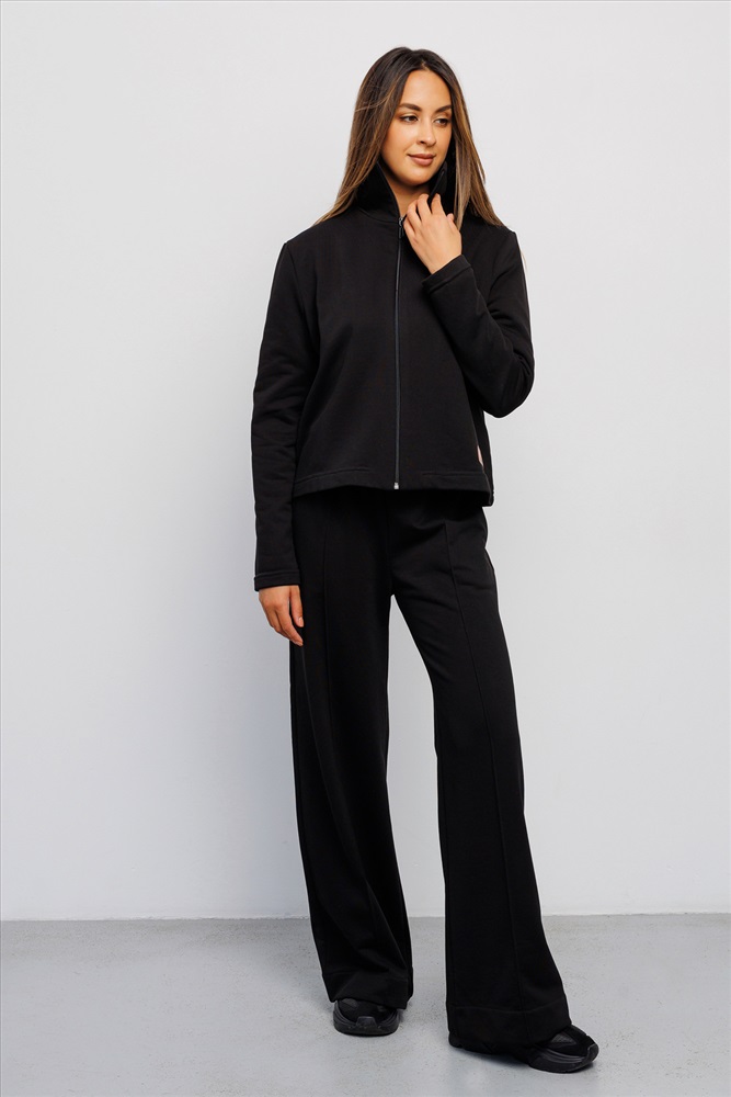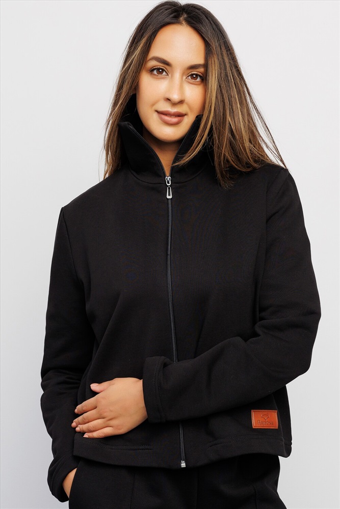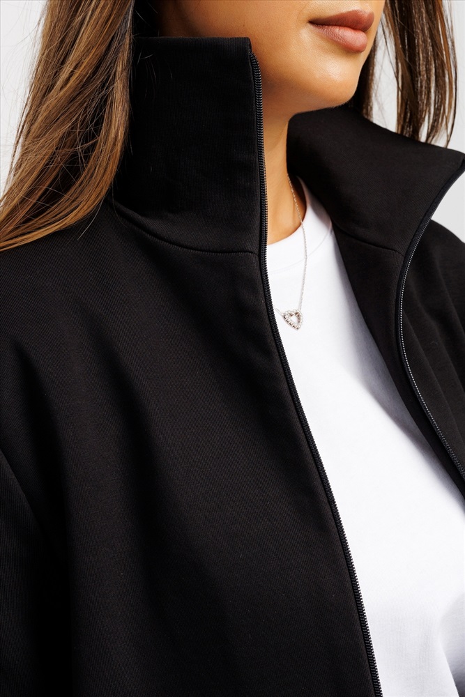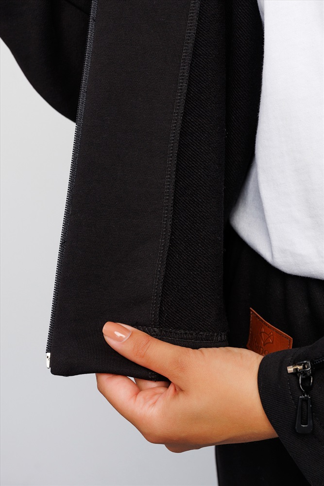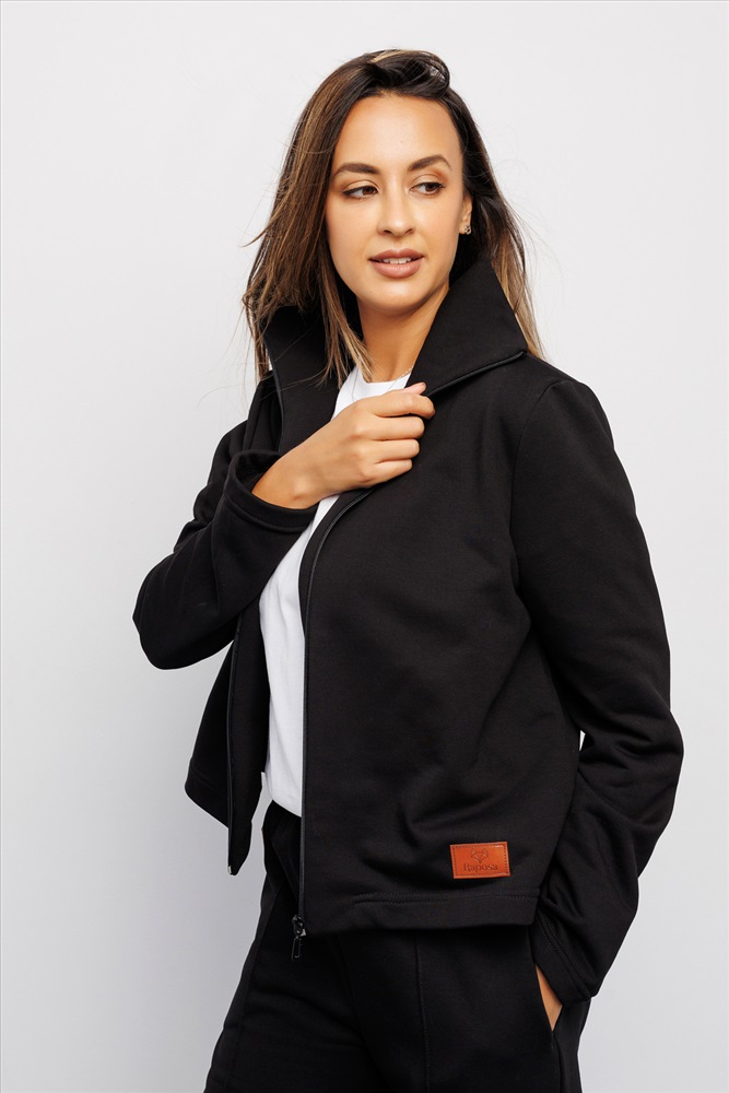 Эта трикотажная спортивная олимпийка, зипка, выполнена в классическом черном цвете, который выгодно подчеркнет стиль и станет универсальной кофтой для повседневной носки или для фитнеса.