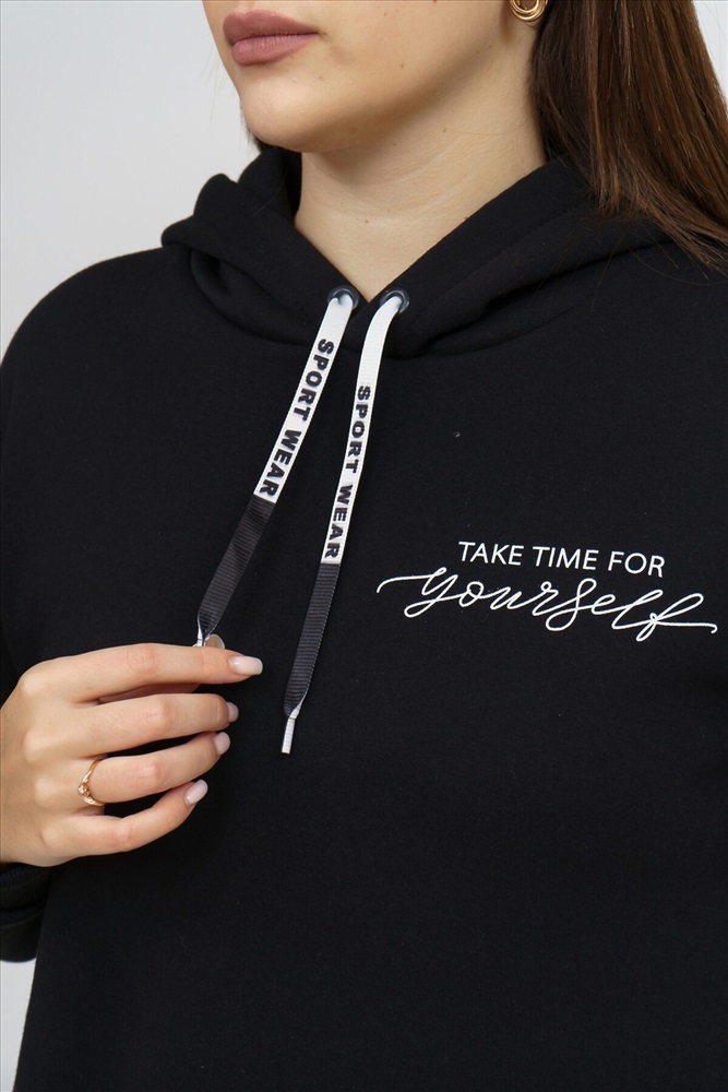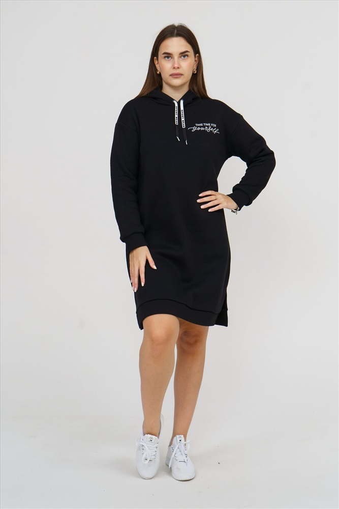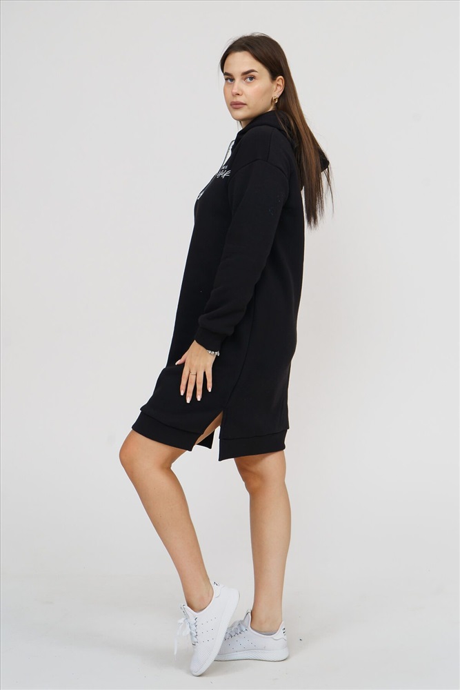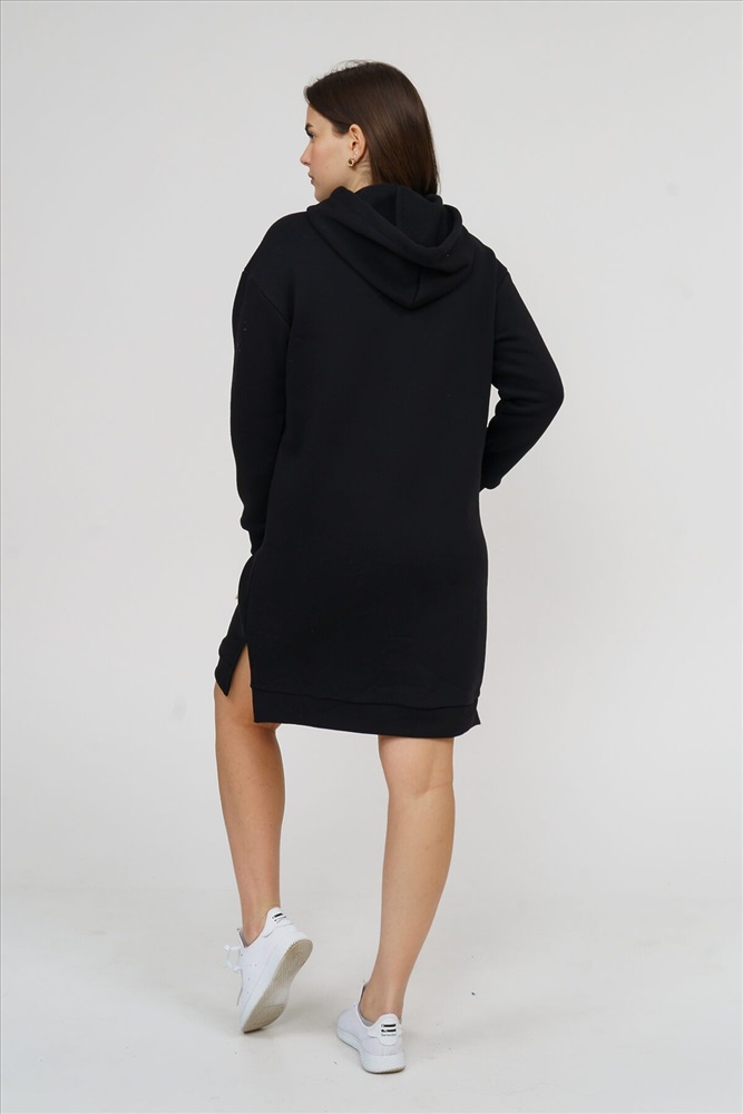 Страна производства: Россия Платье женское прямого силуэта, с капюшоном, с разрезом по боковым швам. Рукав втачной, длинный, на манжете. Полочка на груди украшена буквенным принтом.