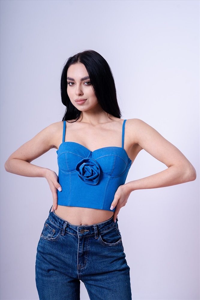 Женский топ корсетный на узких бретелях плотно прилегающего силуэта. По центру изделия декоративный цветок из основного полотна. Чашечки на поролоне с косточками, на корсетной части топа вставлены пластиковые косточки. Корсет утягивающий дополнен застежкой-молния на спине, что позволяет легко надевать и снимать.