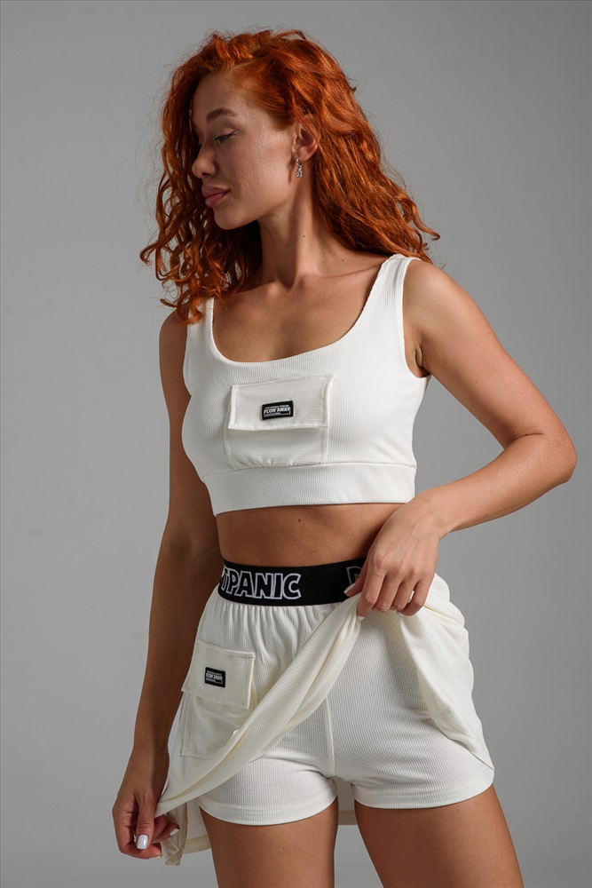 Стиль: повседневный | спортивный Топ спортивный выполнен из эластичной приятной к телу ткани в мелкий рубчик. Топ двухслойный хорошо держит грудь и не просвечивает. Дополняет кроп-топ маленький нагрудный кармашек с клапаном и декоративным шевроном. Отлично сочетается со спортивными брюками,шортами,юбками!