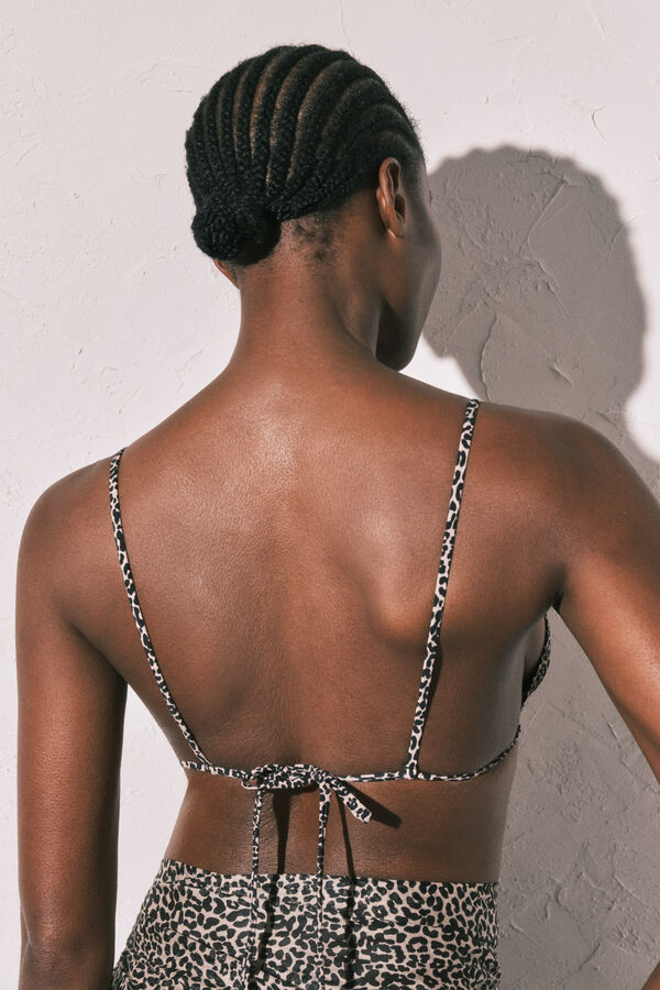 Top de bikini tipo triangular con diseño estampado de animal print y detalle sutil de abalorio en el centro del pecho. Copas extraíbles que moldean el busto y proporcionan una buena sujeción.Tirantes multiposición (hombro-cuello). Completamente forrado.