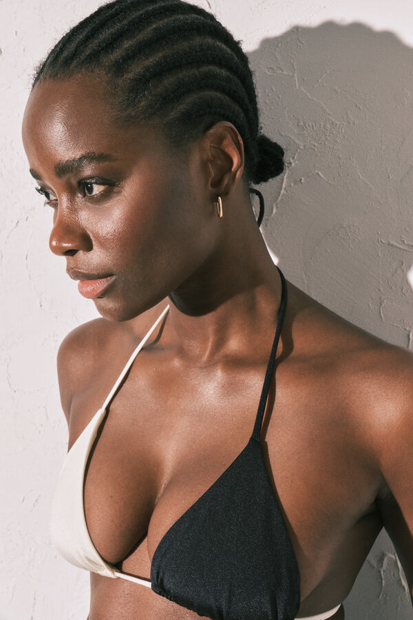 Top de bikini tipo triangular con diseño color block en blanco y negro de tejido semi brillante. De tirantes finos que se anudan en el cuello mediante lazo. Con copas extraíbles que moldean el busto y proporcionan una buena sujeción. Sin aros. Completamente forrado.