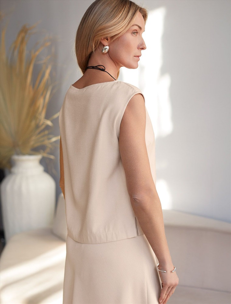 Изысканный топ овсяного цвета с элегантным вырезом-лодочкой, выполненный из плотного лиоцелла. Лиоцелл это более дорогой и экологичный вариант вискозы, очень прочный и шелковистый.Ткань отличается от регулярной коллекции из лиоцелла - она содержит еще больше лиоцелла (92%), благодаря чему имеет более нежную шелковистую фактуру. Вырез лодочка придает топу утонченность, а небольшие разрезы по бокам добавляют легкости. Простой прямой крой в сочетании с интересными деталями создает стильную и в то же время комфортную вещь. Топ средней длины подойдет для любительниц базовой одежды, которые хотят деликатно повысить градус своего стиля. Этот лаконичный топ будет идеальным выбором для теплого времени года или многослойных ансамблей. Комплект из лиоцелла подчеркнет ваш вкус и статус. Это идеальный выбор для особенных моментов. Такой образ будет уместен на торжественных мероприятиях и приемах, выпускных вечерах, семейных праздниках и свадьбах.