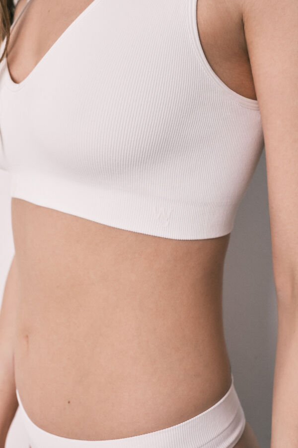 Sujetador halter tipo top liso, en tejido de microfibra clean cut, con acabados termosellados. Con relleno extraíble, escote en pico y detalle de logo en el bajo. Úsalo como sujetador o como top. ¡Tú eliges!