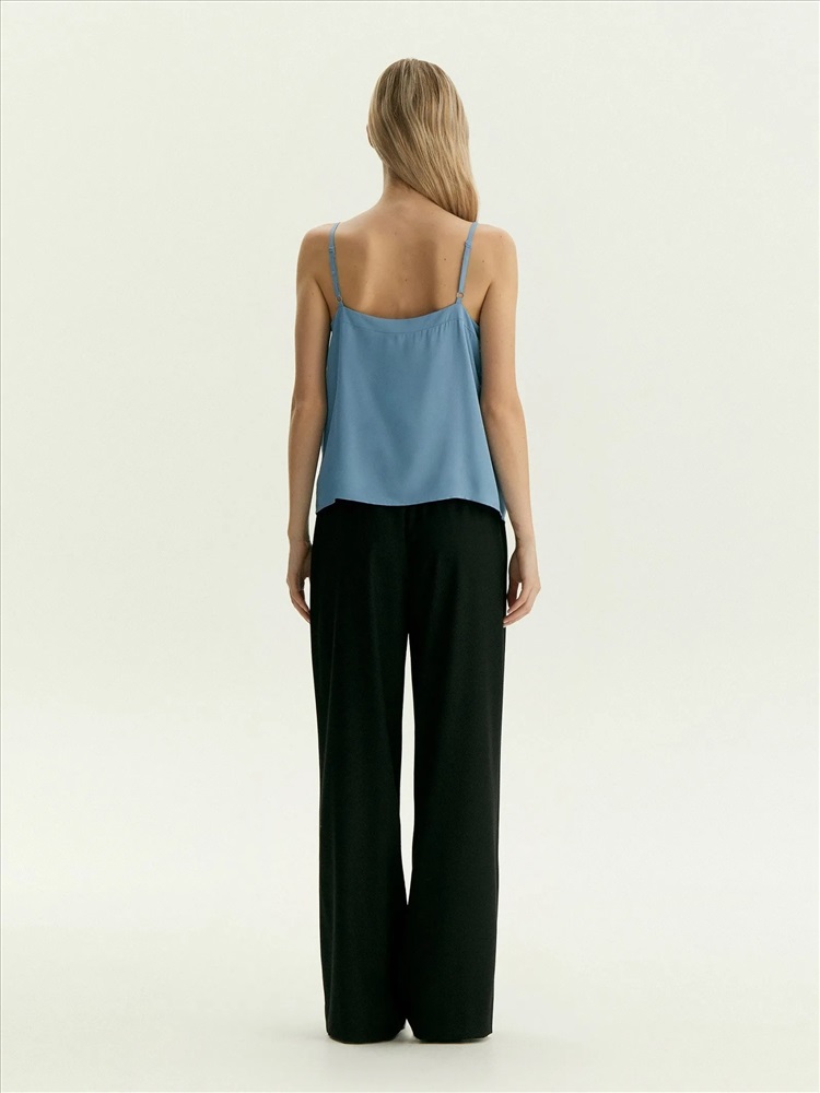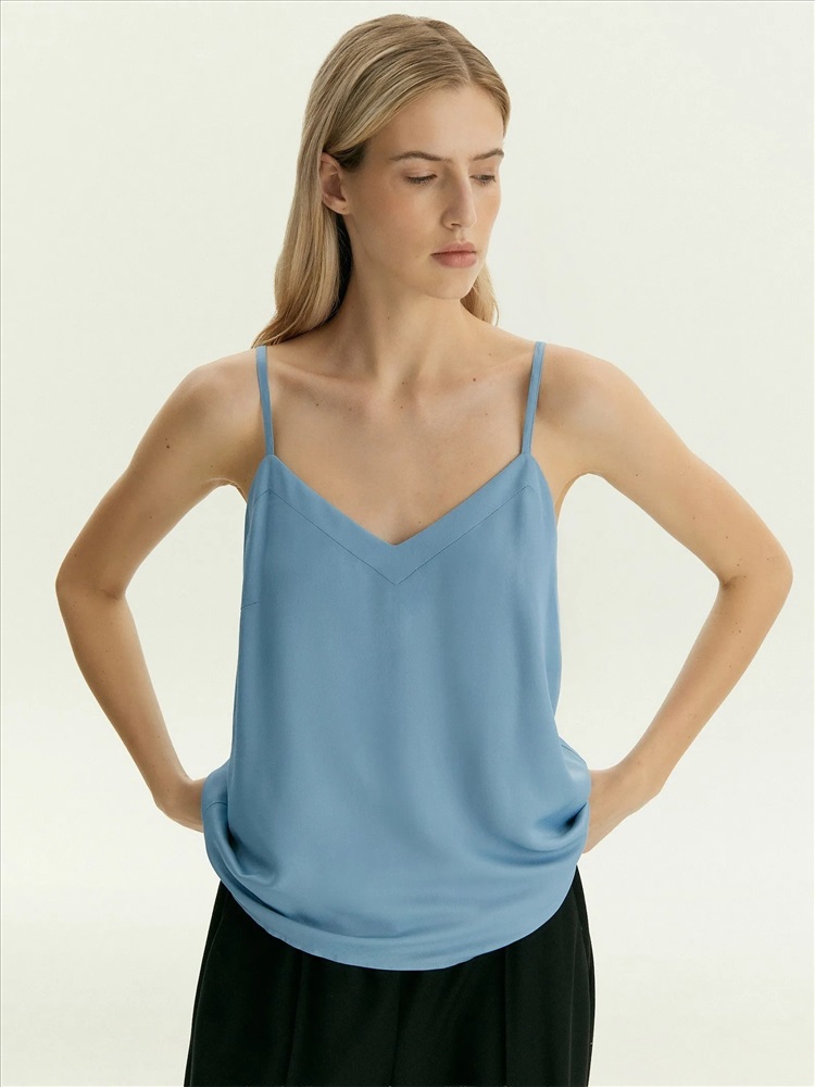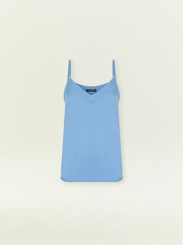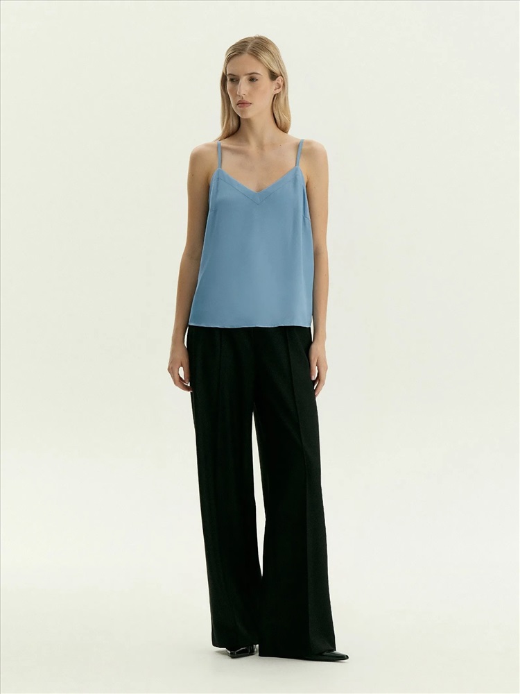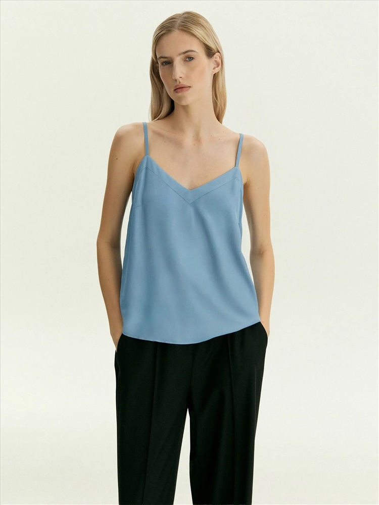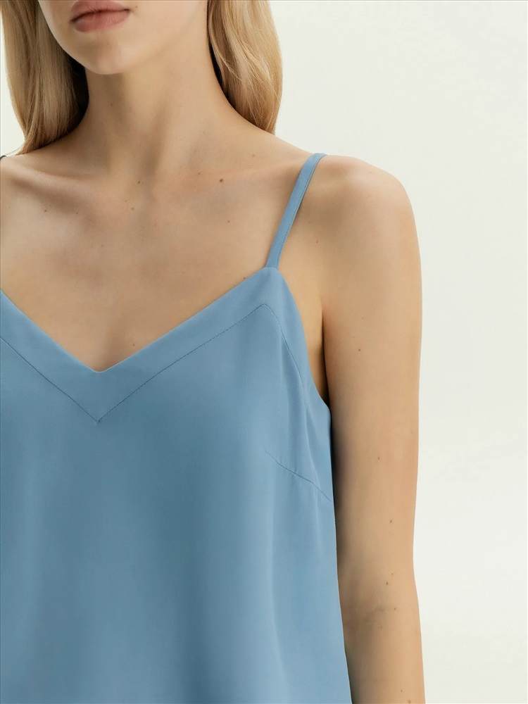 Топ с треугольным вырезом на тонких бретелях отлично подойдёт как база для любых повседневных образов. Бретели можно регулировать. Топ сделан в голубом цвете из приятной к телу вискозы, на вискозной подкладке.