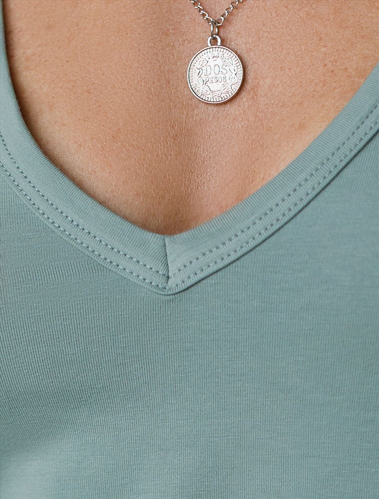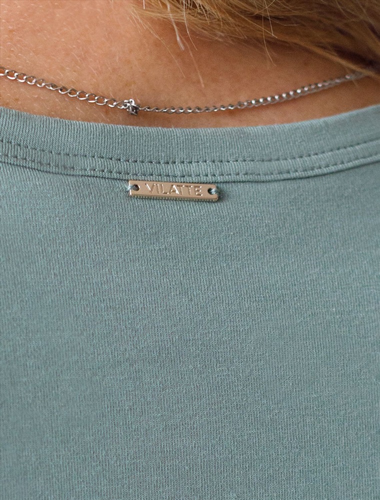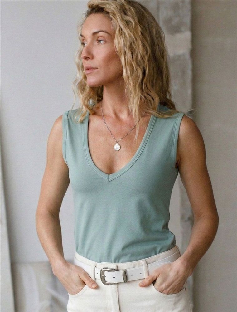 Топ выполнен из премиального хлопка с эластаном. V- вырез подчеркивает линию декольте и визуально вытягивает шею. Лаконичная базовая модель впишется в любой гардероб и дополнит многослойные образы. Материал изделия хорошо тянется и гарантирует идеальную посадку по фигуре. Топ украшен только металлическим логотипом бренда.