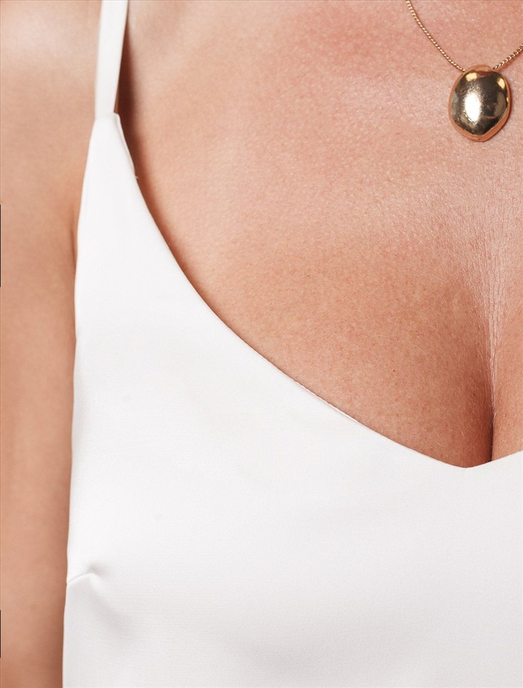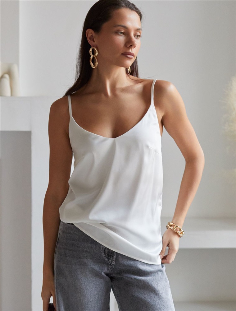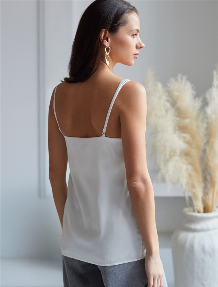 Элегантный топ натурального белого цвета с регулируемыми лямками выполнен из сатиновой ткани премиального качества, сочетающей полиэстер и эластан в составе. Этот уникальный дуэт материалов обеспечивает комфортную посадку топа. Универсальный крой делает топ идеальным базовым элементом как для повседневных образов с джинсами или юбкой, так и для вечерних луков под жакет или кардиган.