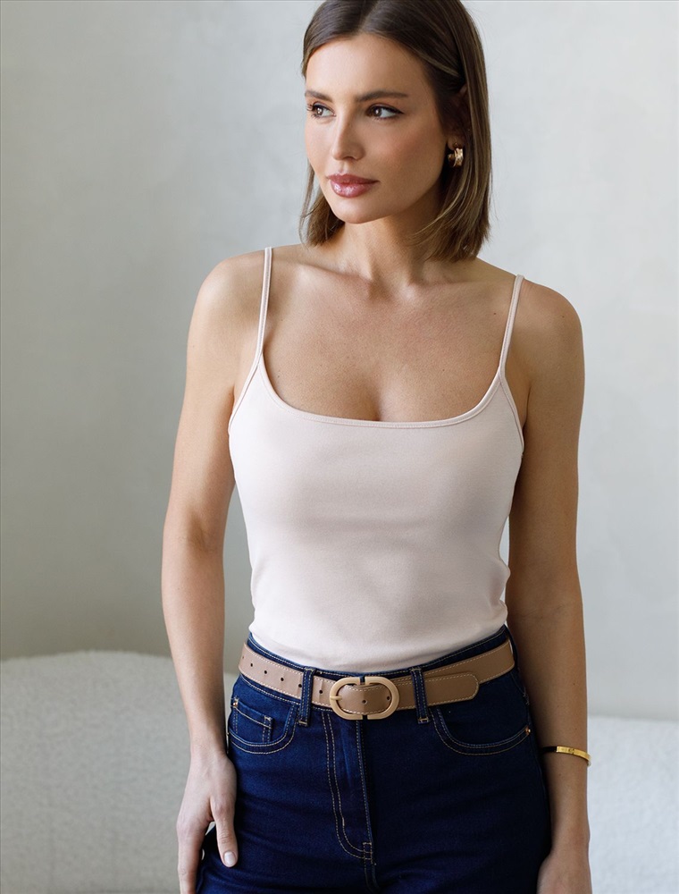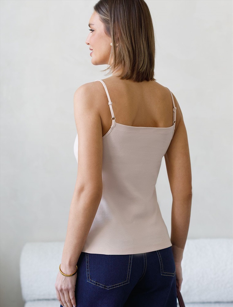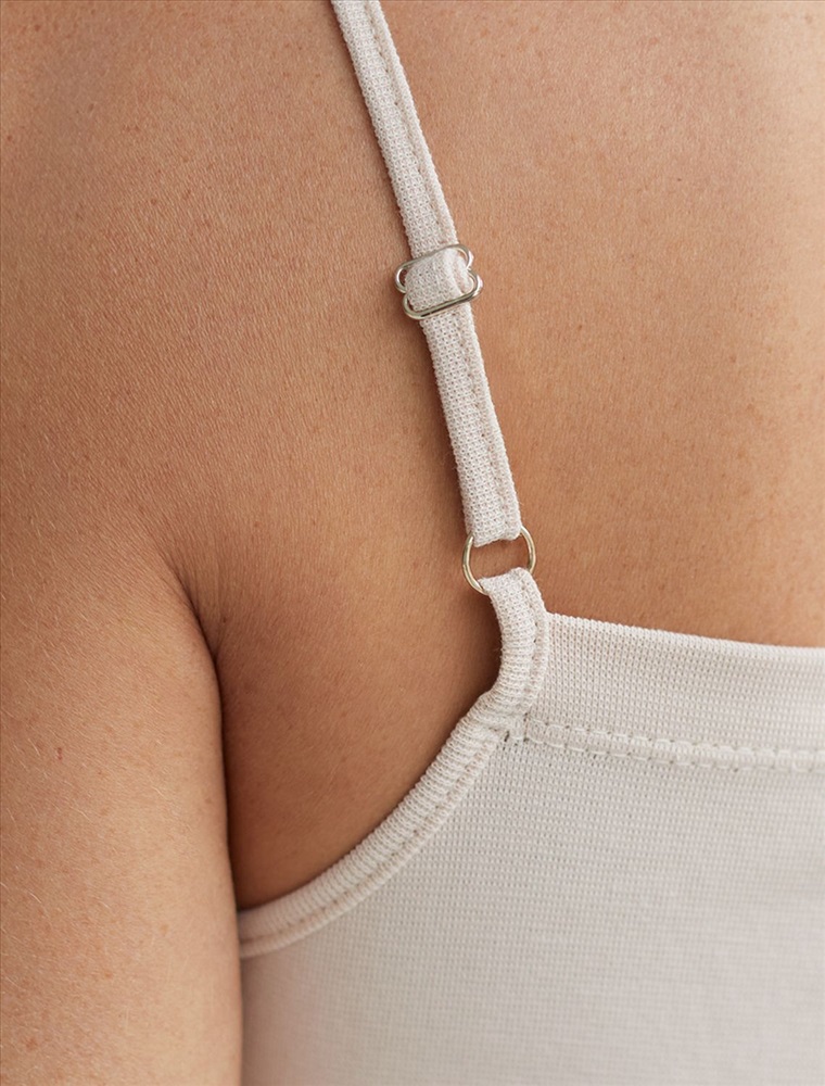 Идеальный базовый супер-эластичный топ облегающего кроя приятного светло-бежевого цвета в выполнен из премиального трикотажа риб 1*1. Ткань приятна на ощупь, имеет отличную воздухопроницаемость, что обеспечивает комфорт в жаркую погоду, в тоже время не просвечивает, выглядит дорого. Открытое декольте и аккуратные тонкие регулируемые бретели деликатно подчеркнут изящную шею и плечи.