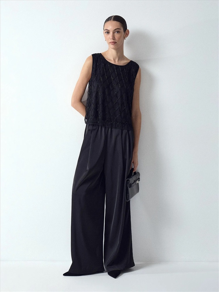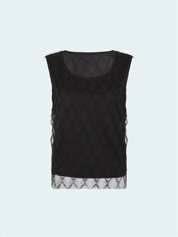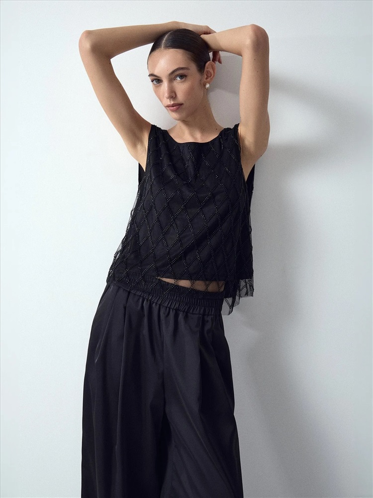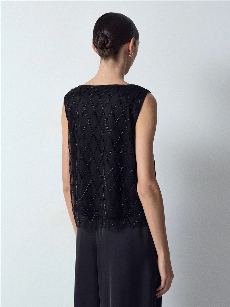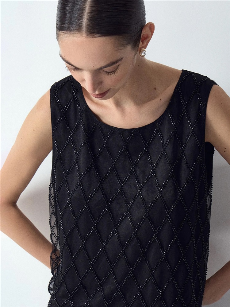 Топ создаст чарующий образ к особому случаю. Особую прелесть вещи обеспечивает воздушная органза на чёрном сатине, декорированная бисером и стеклярусом чёрного цвета. Простая и элегантная модель, без рукавов и с круглым вырезом, подходит к любому лаконичному низу. Образ в стиле lady like можно дополнить перчатками и клатчем.