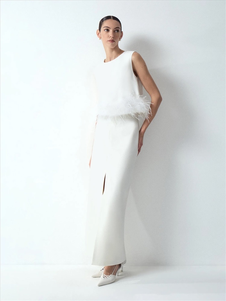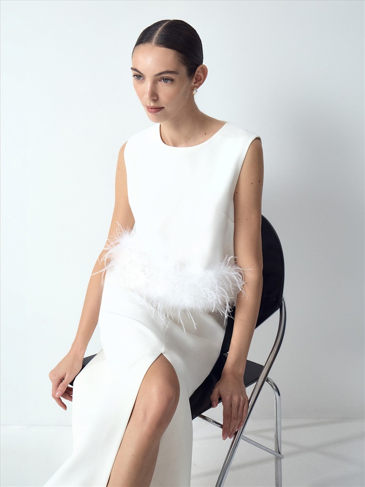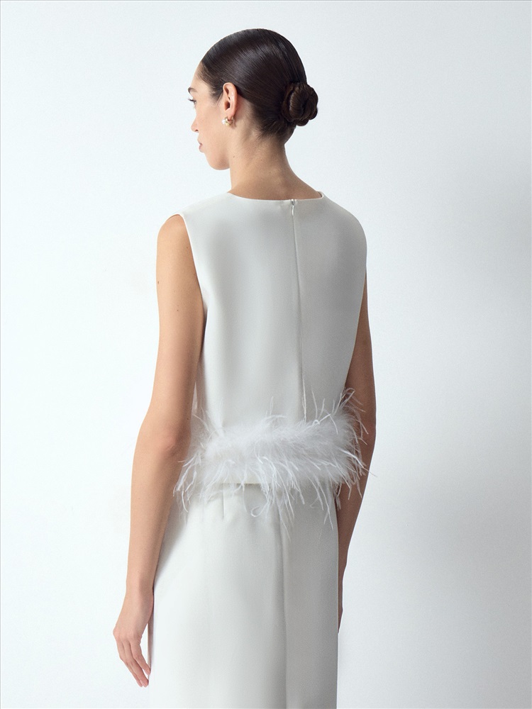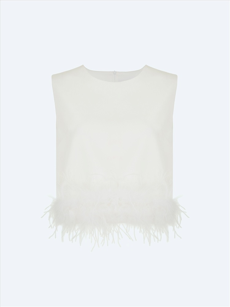 Коктейльный топ в белом цвете с двойным рядом перьев по низу. Укороченная прямая модель с круглым вырезом отлично подойдёт к брюкам или юбкам с завышенной посадкой. С топом можно собирать запоминающиеся монохромные образы или сделать его единственным акцентом образа. Изделие выполнено на подкладке. Перьевой декор не отстёгивается.